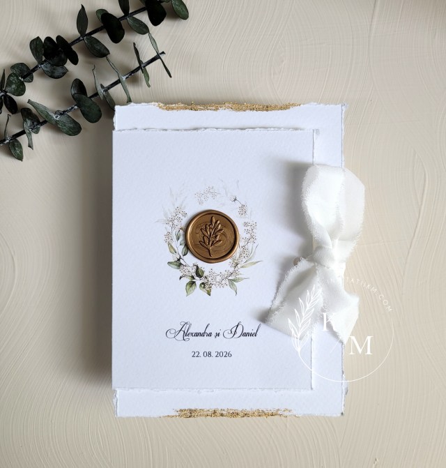 Opis/Panou plexiglas cu liste asezare invitati la mese si sigilii aurii “Be our guest” 06/09/202505/12/2025