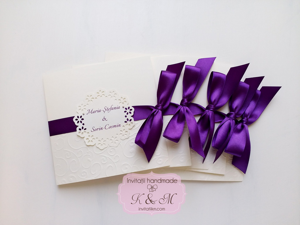 Invitatie handmade realizata din carton ivory embosat partial/complet, fundita din satin si eticheta dantelata