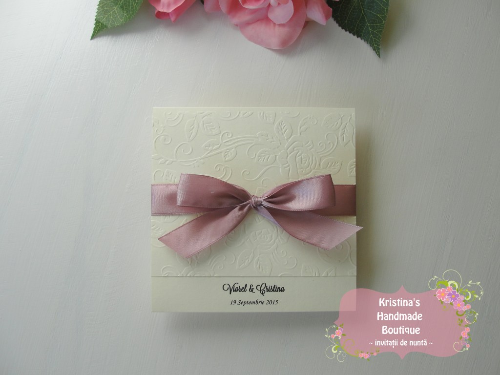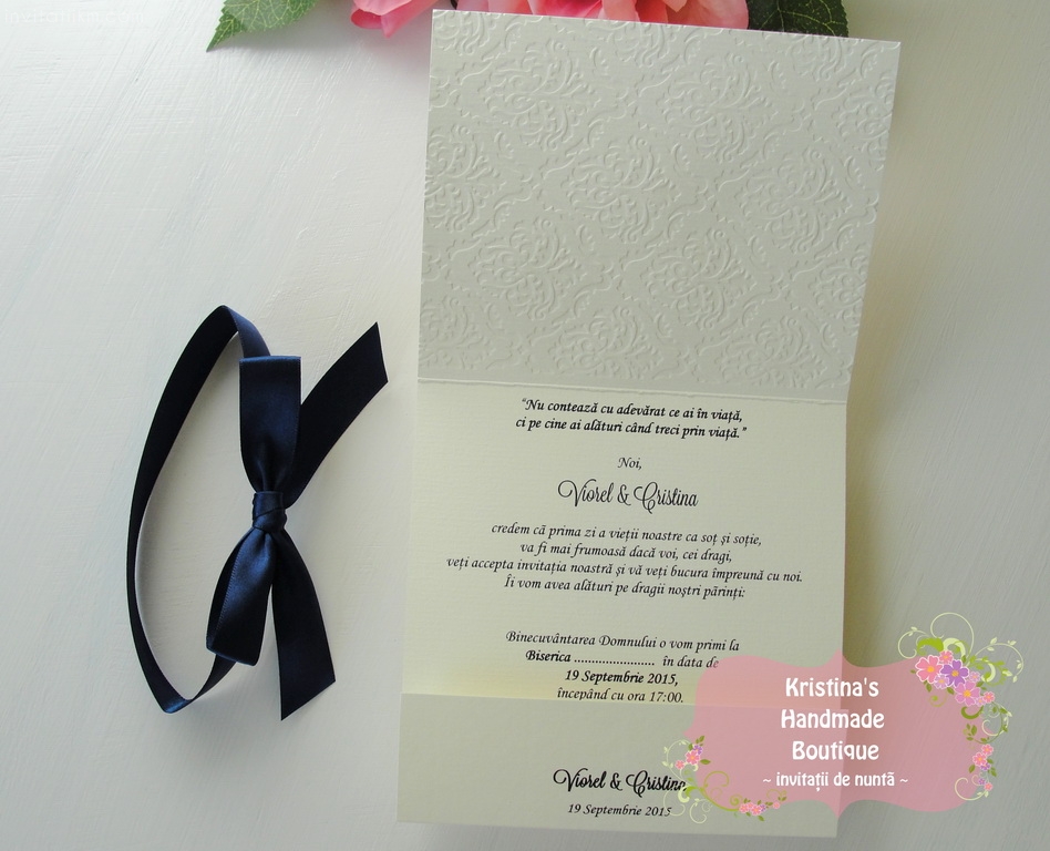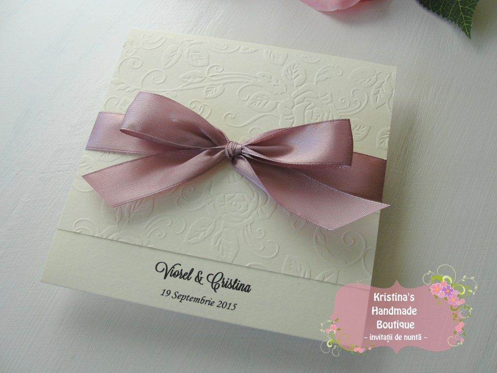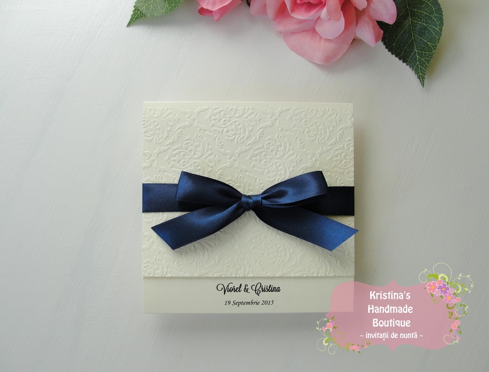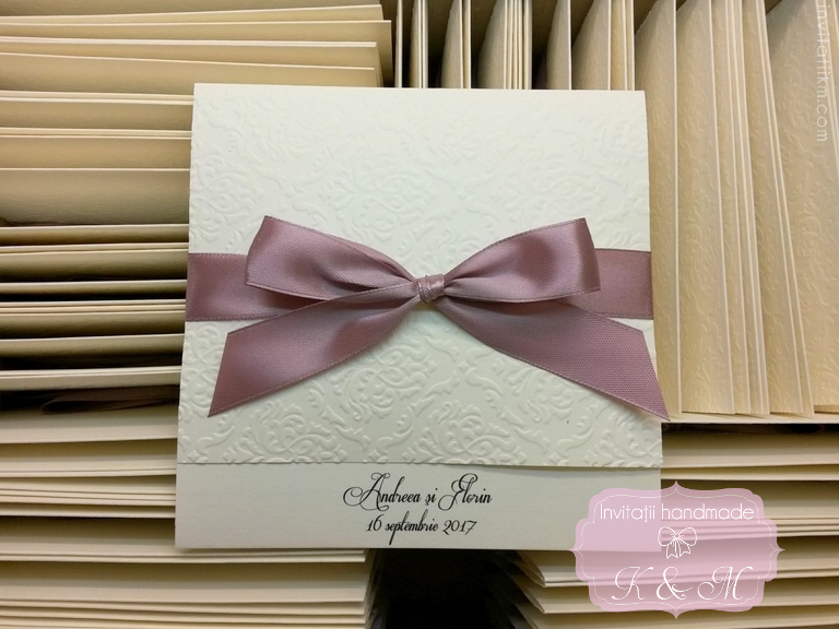 Invitatie handmade realizata din carton ivory embosat si fundita eleganta din satin. Nu necesita plic.