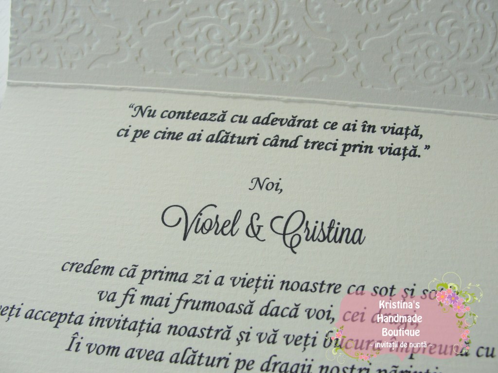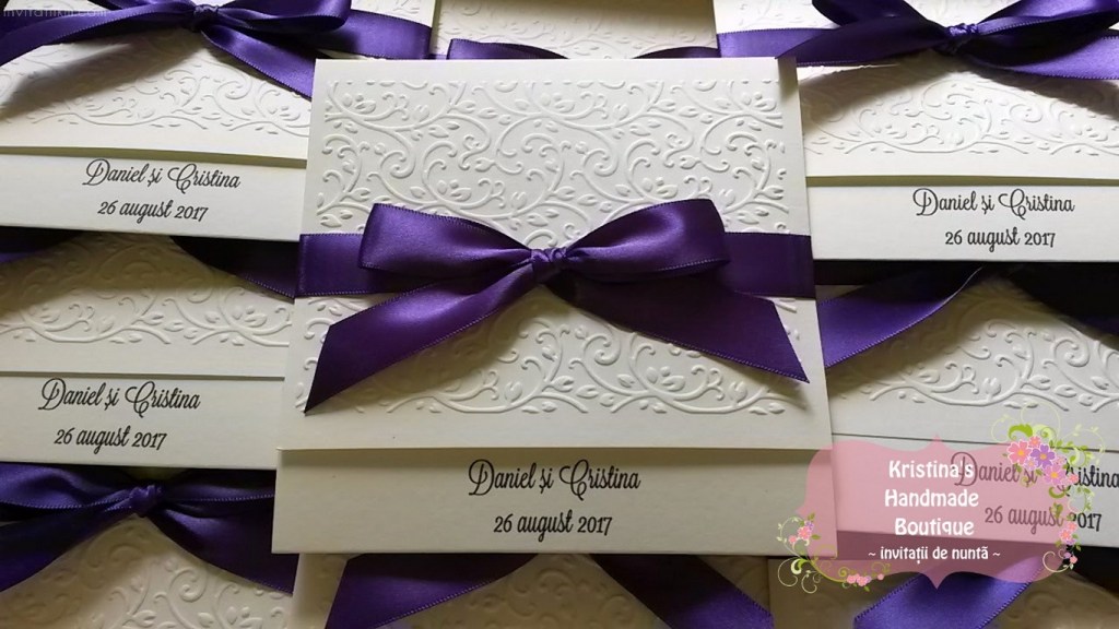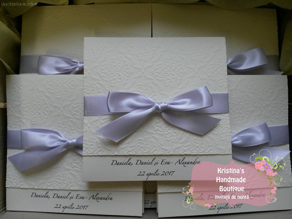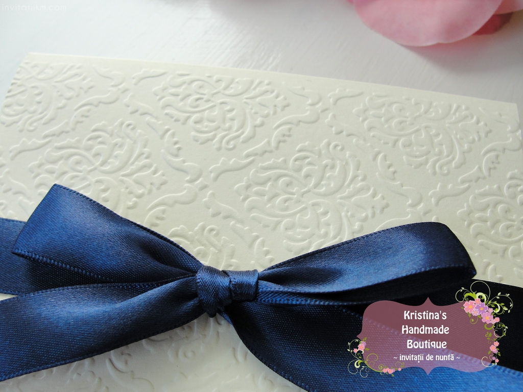 Invitatie handmade realizata din carton ivory embosat si fundita eleganta din satin. Nu necesita plic.