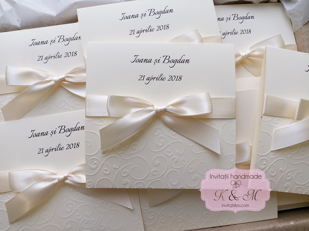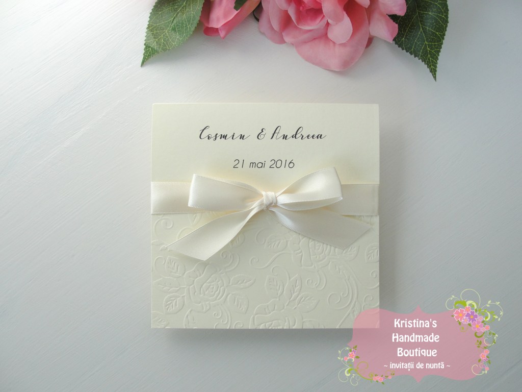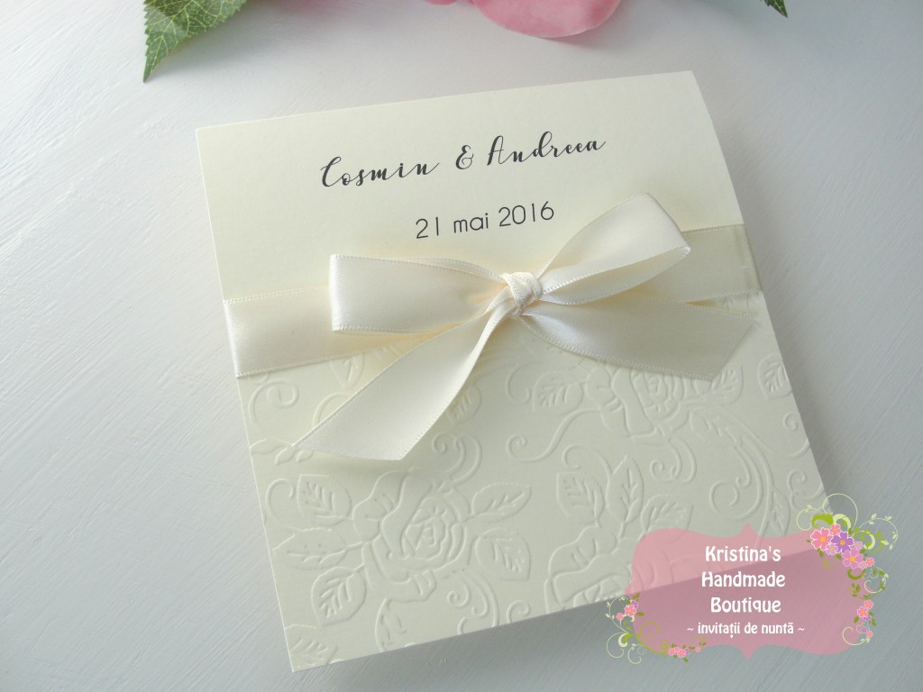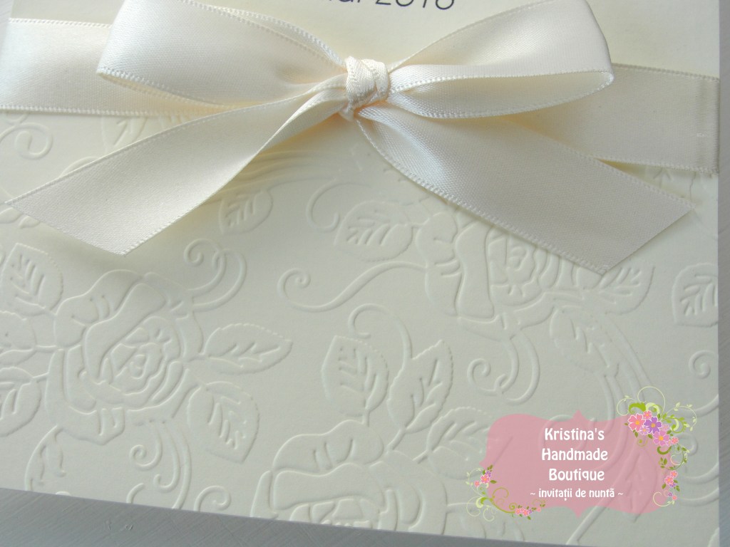 Invitatie handmade embosata realizata din carton ivory si fundita din satin. Este realizata tip felicitare, cu deschidere de jos in sus.
