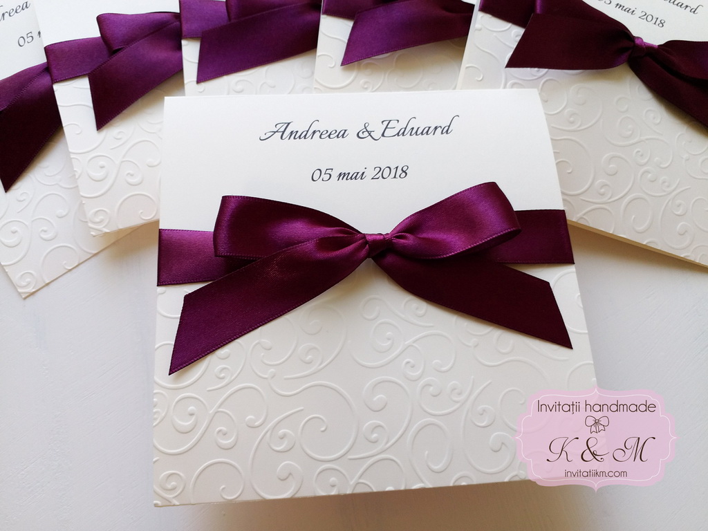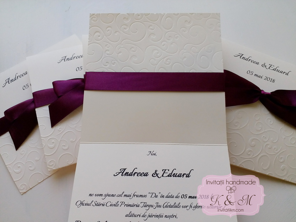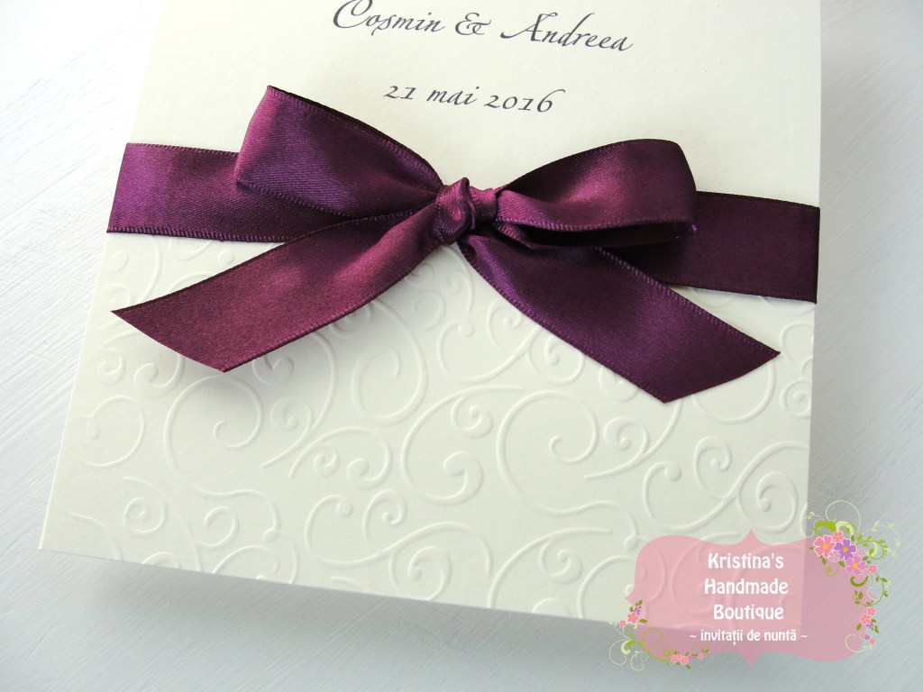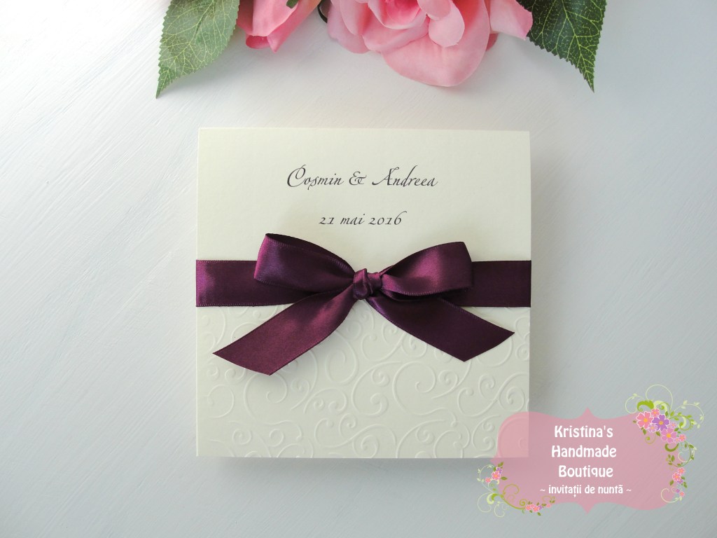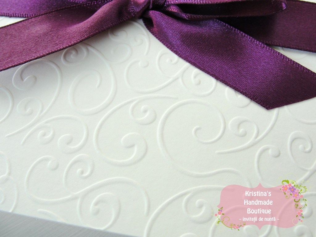 Invitatie handmade embosata realizata din carton ivory si fundita din satin. Este realizata tip felicitare, cu deschidere de jos in sus.
