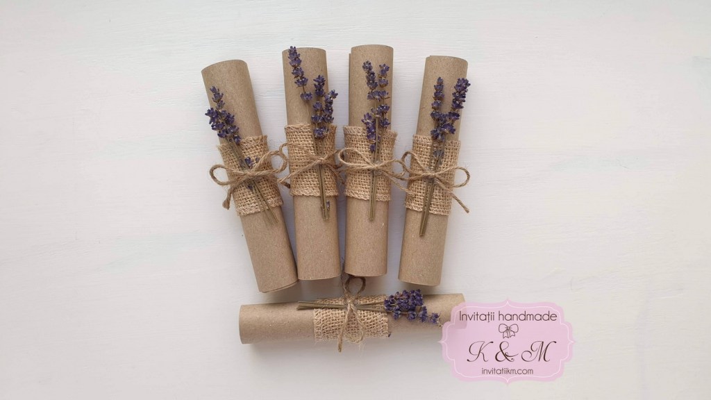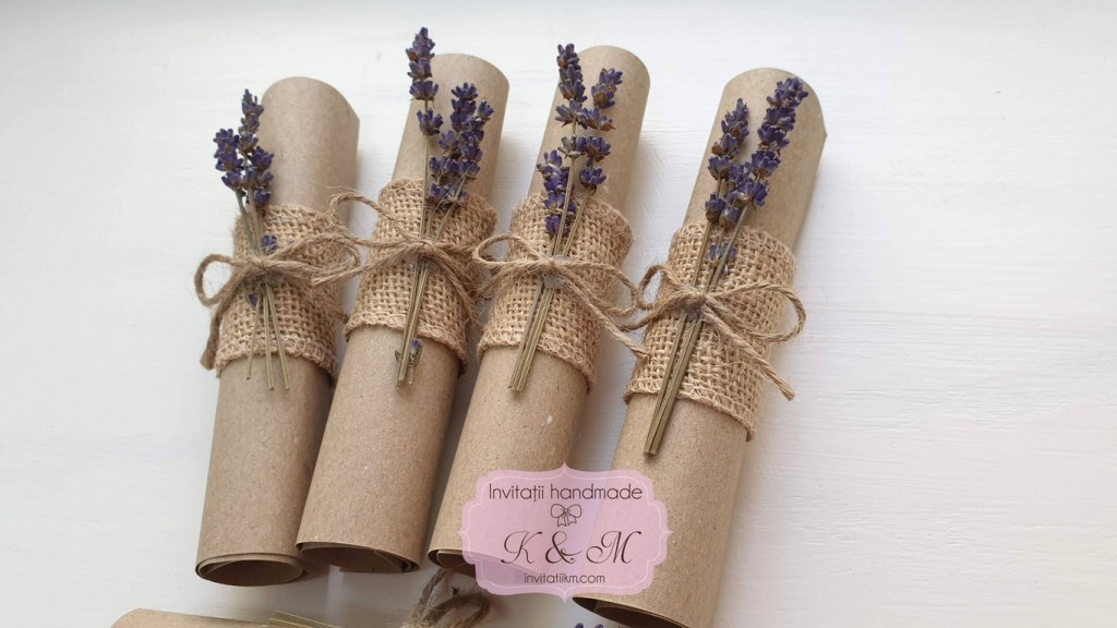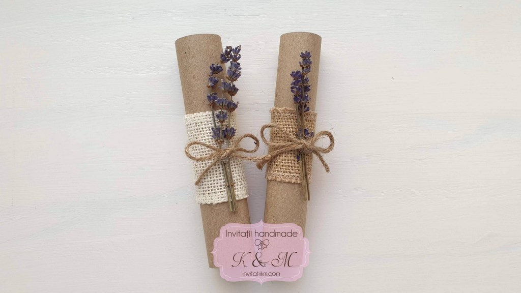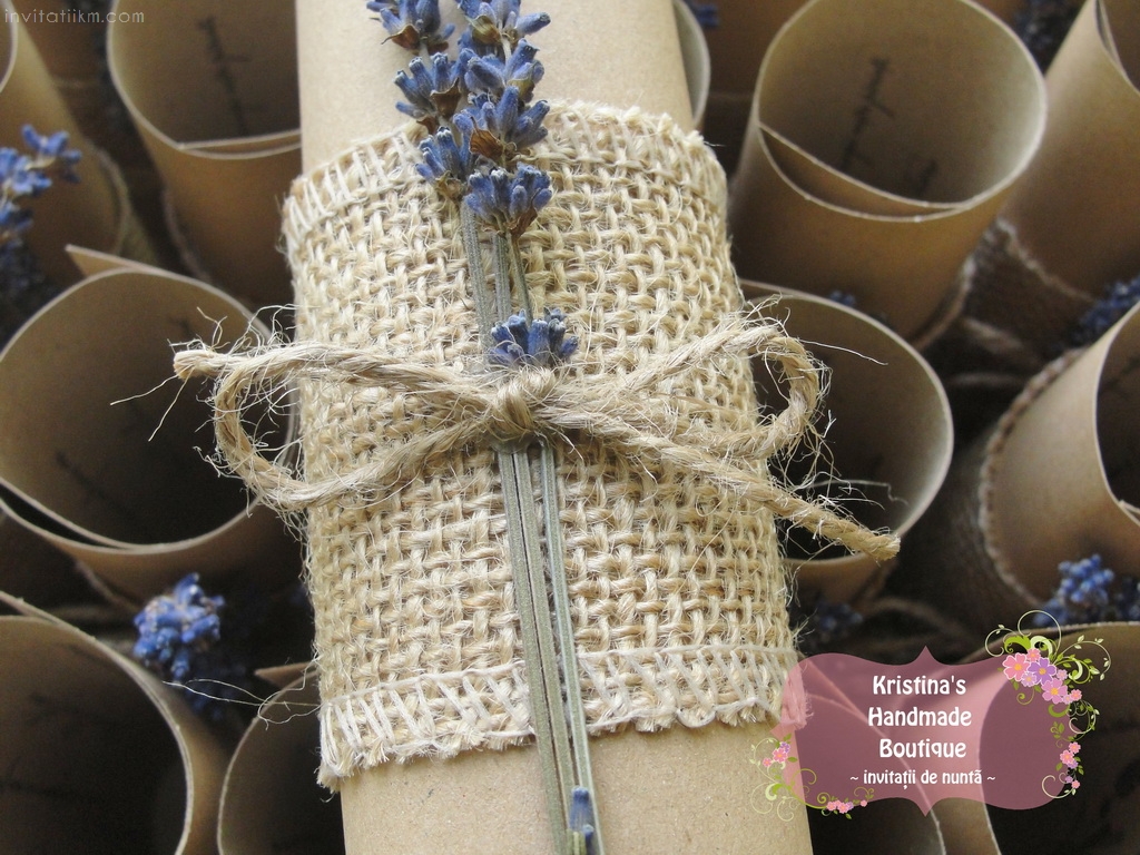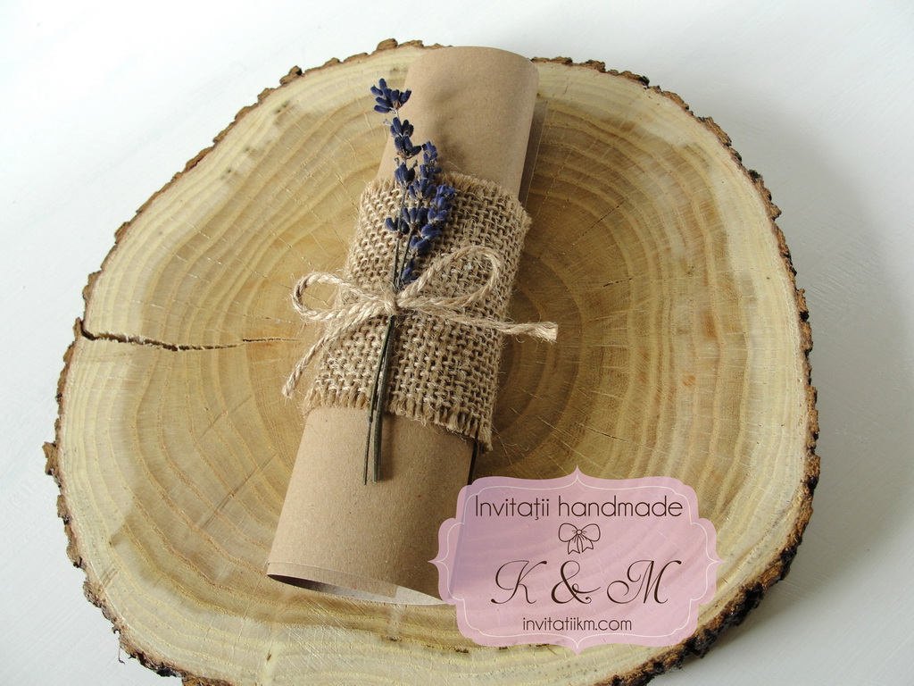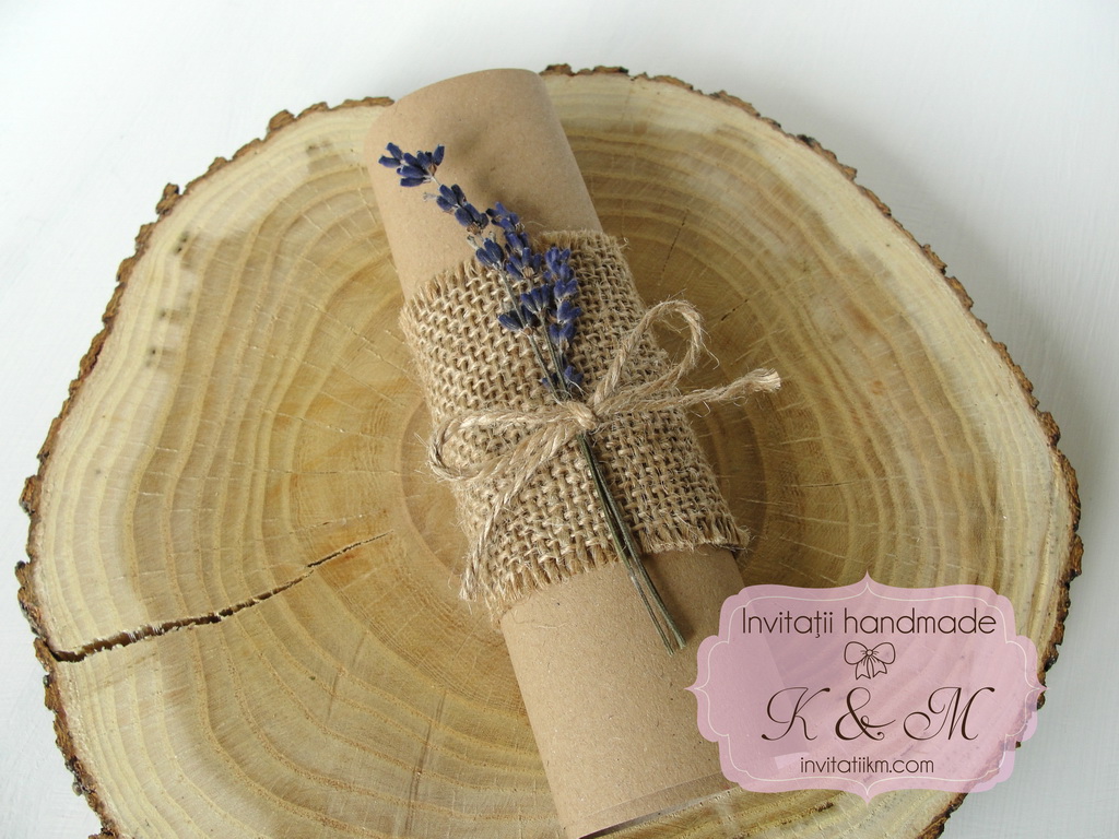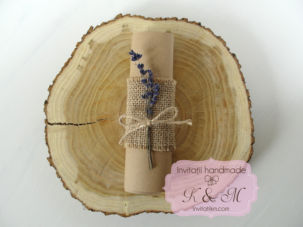 Invitatie handmade in stil rustic din carton reciclat rulat si manson din iuta/panza de sac cu un buchetel de lavanda uscata. Nu are nevoie de plic.