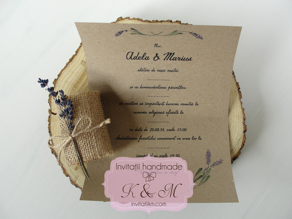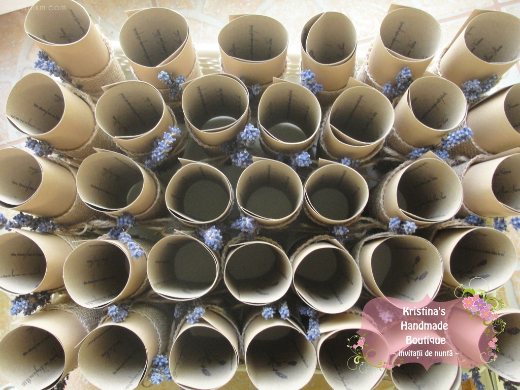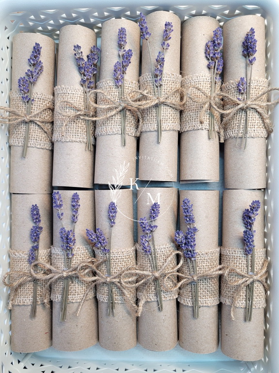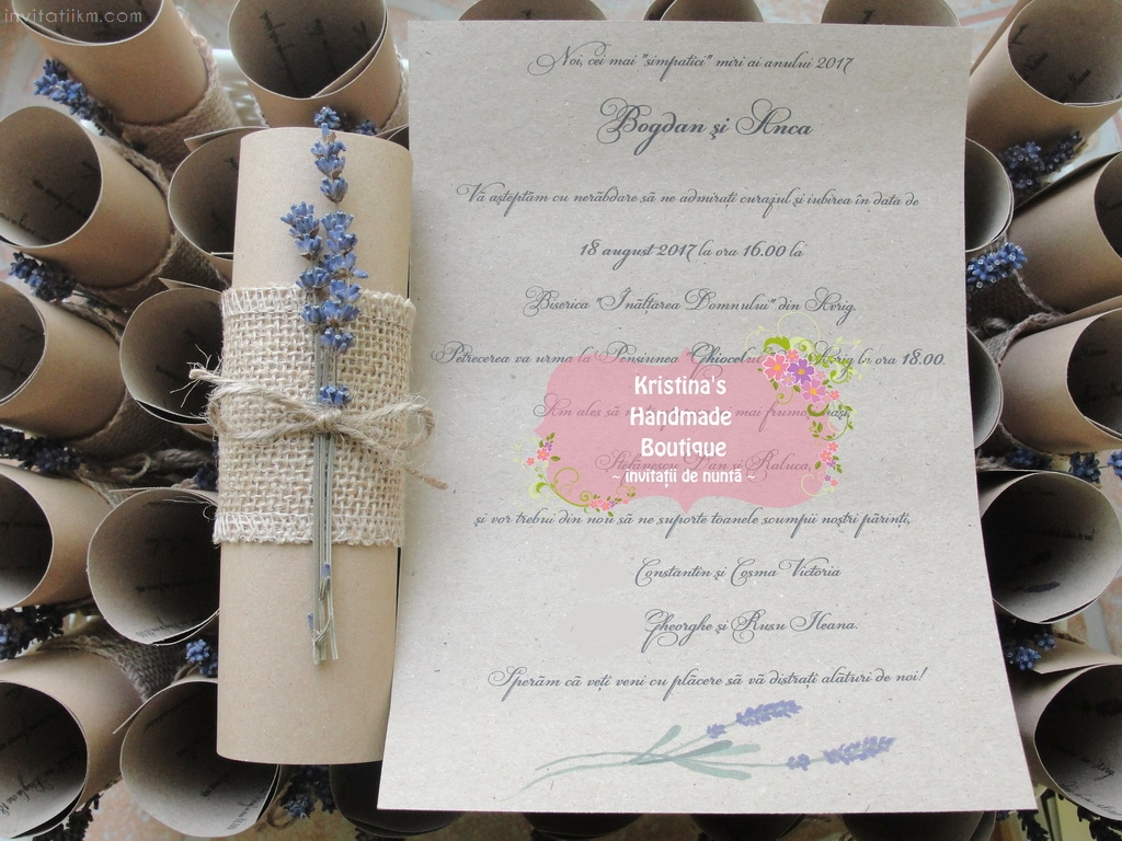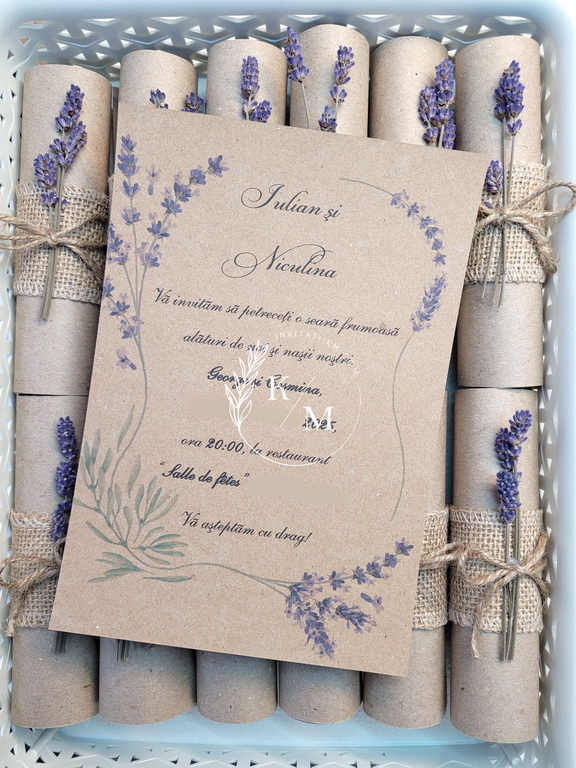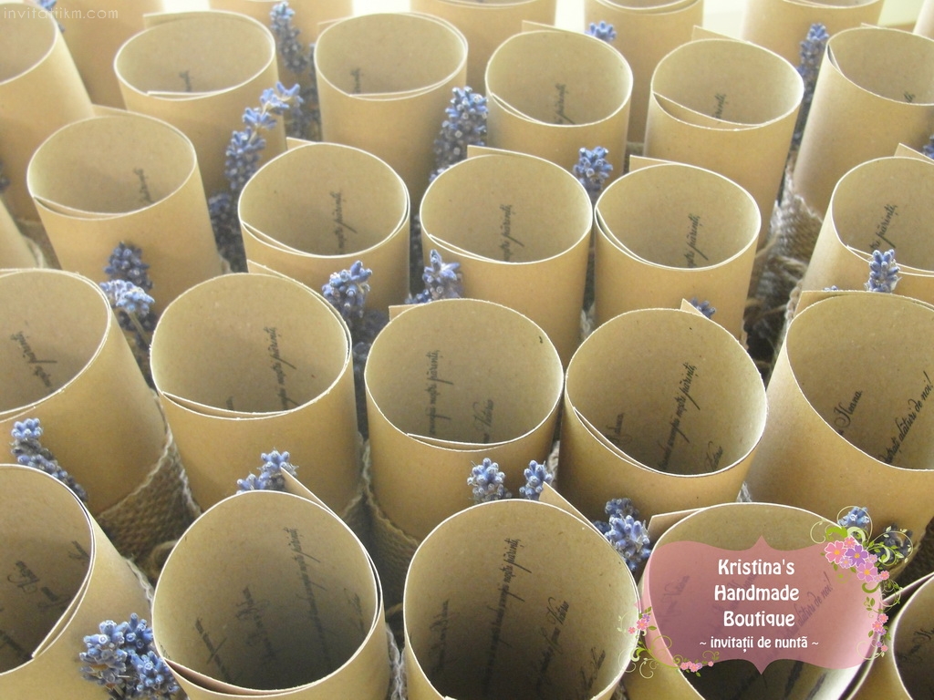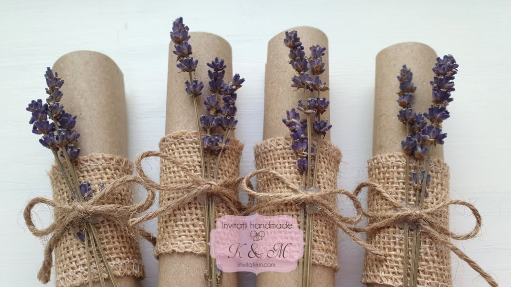 Invitatie handmade in stil rustic din carton reciclat rulat si manson din iuta/panza de sac cu un buchetel de lavanda uscata. Nu are nevoie de plic.