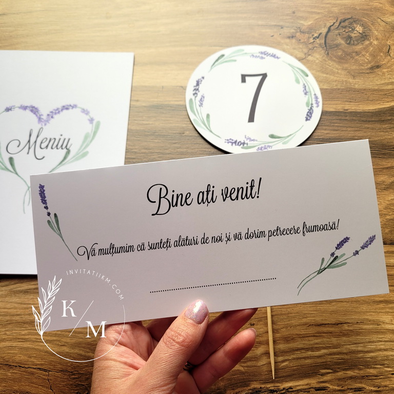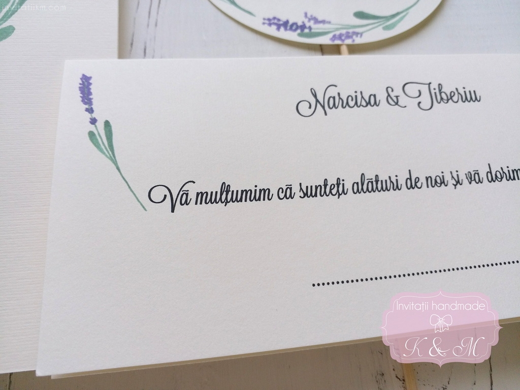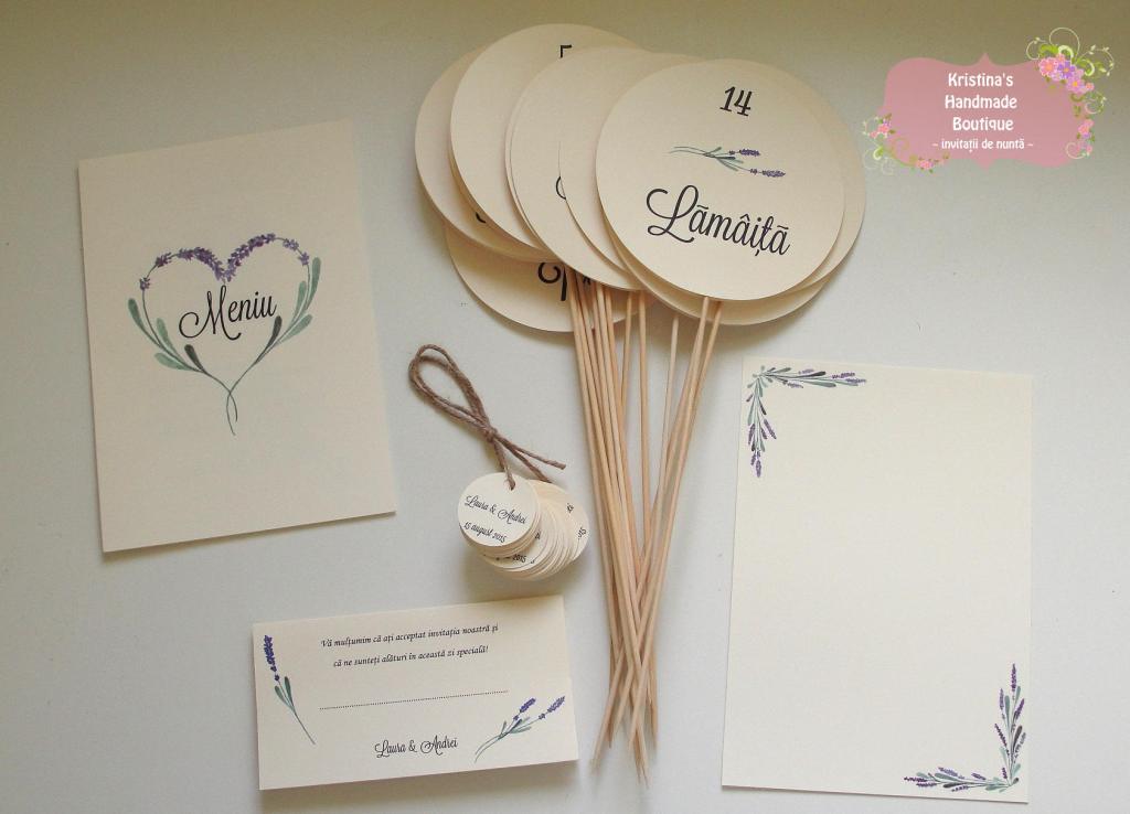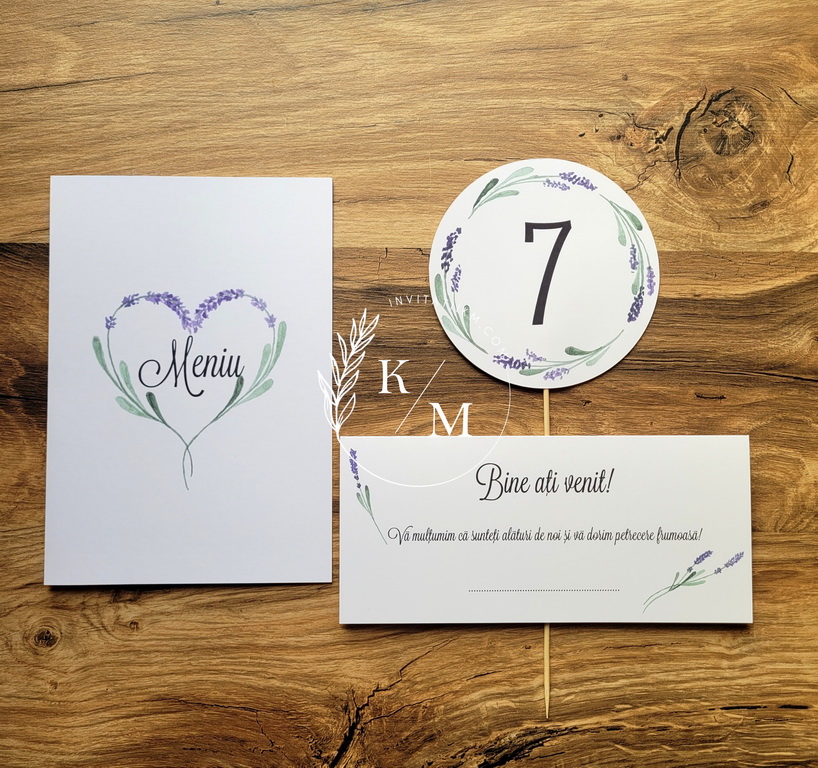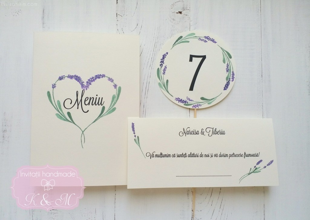 Meniu, numar masa si plic de bani/card de asezare handmade cu lavanda. Numarul de masa pe betisor de bambus poate fi pus in aranjamentul floral.