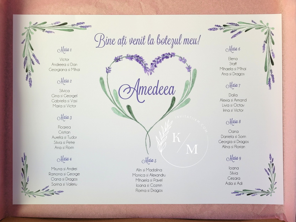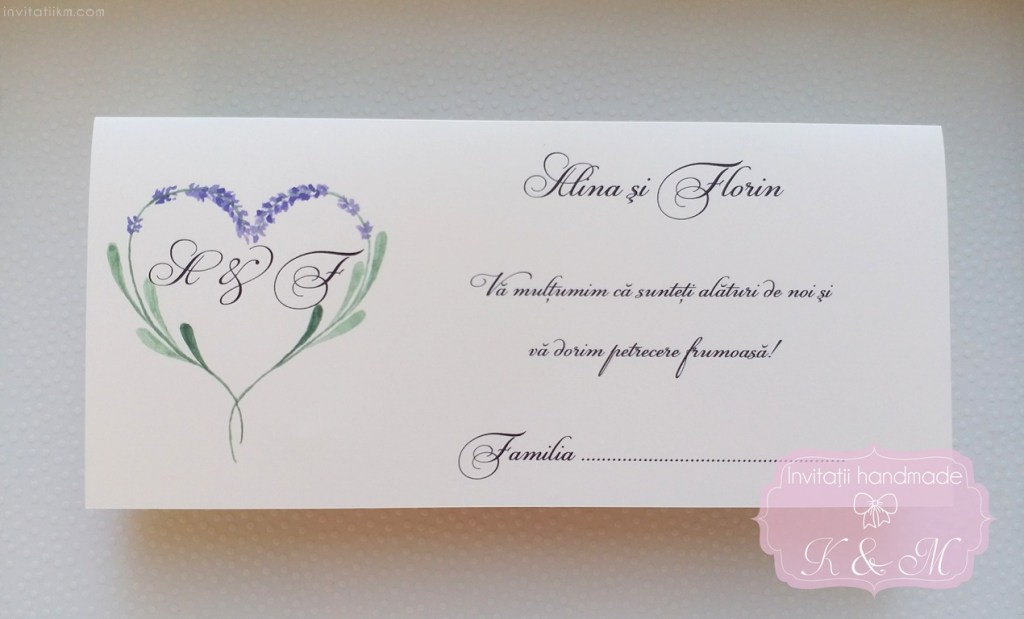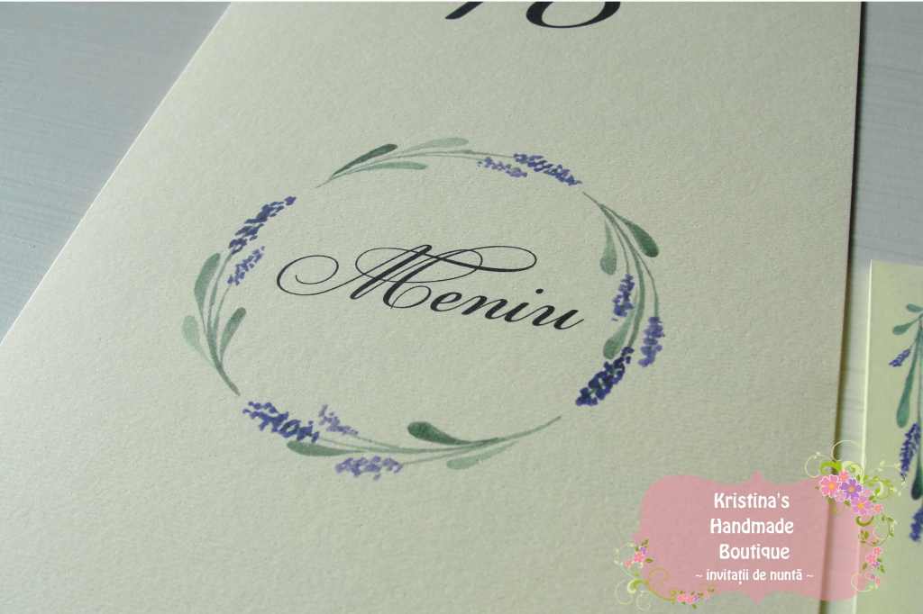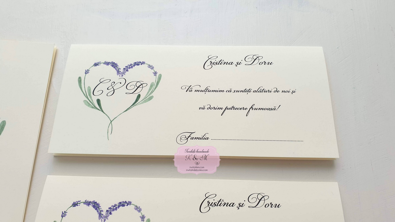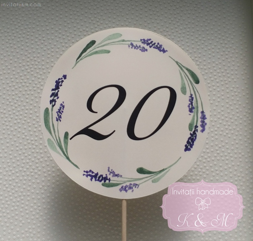 Meniu, numar masa si plic de bani/card de asezare handmade cu lavanda. Numarul de masa pe betisor de bambus poate fi pus in aranjamentul floral.