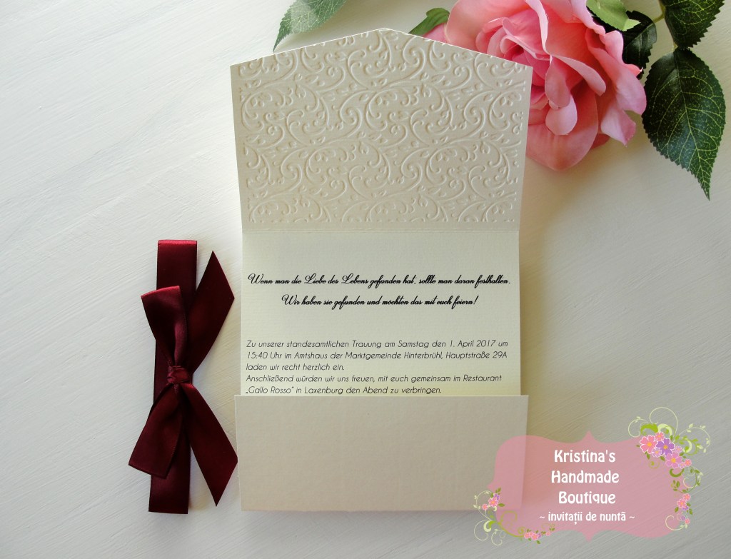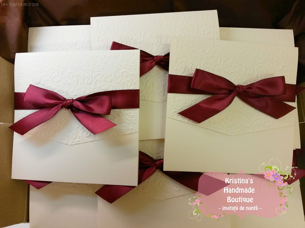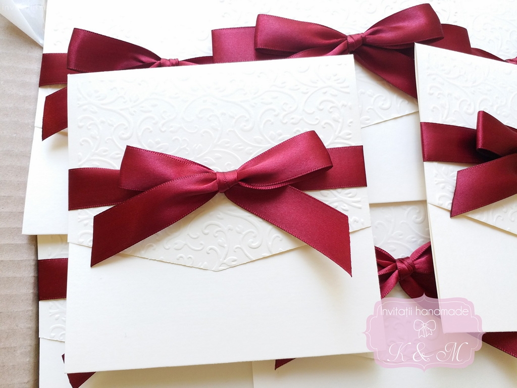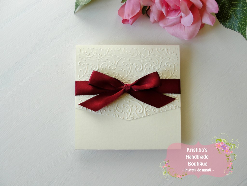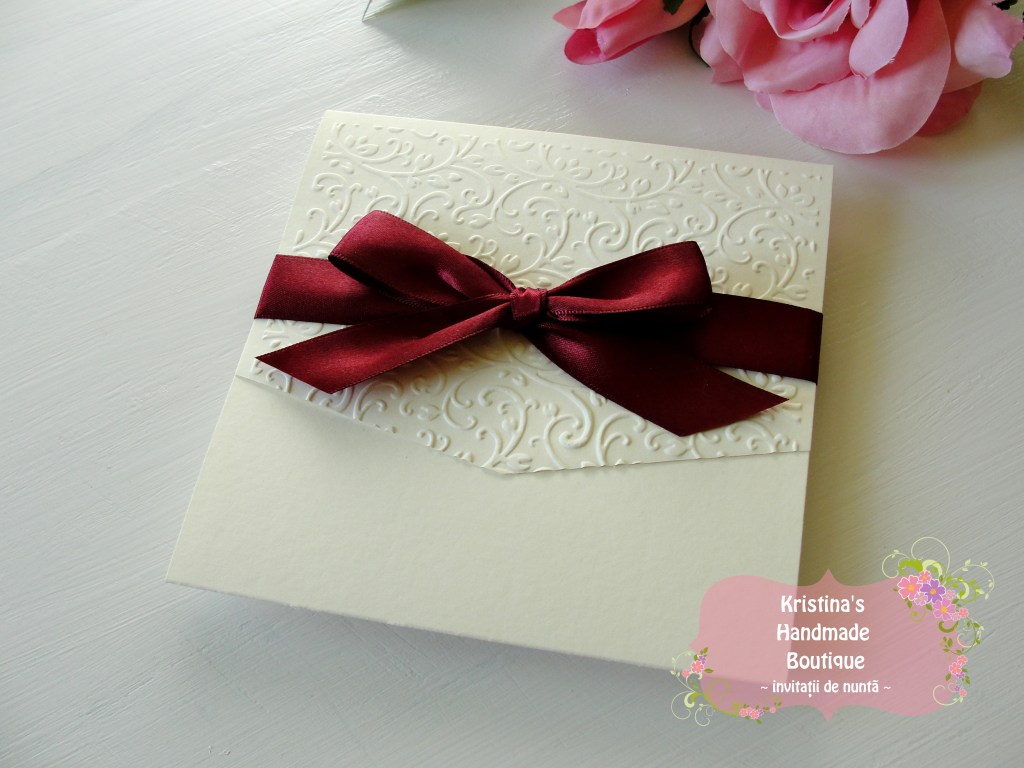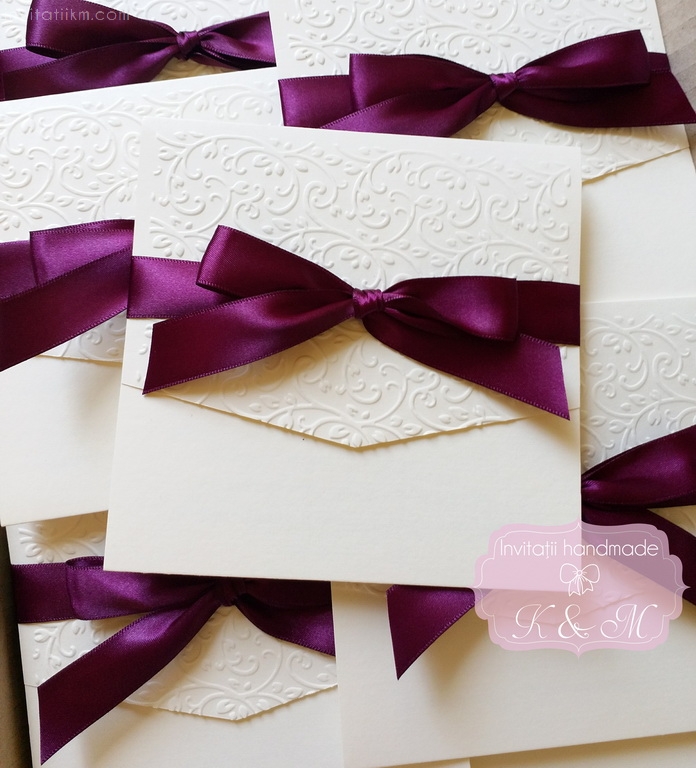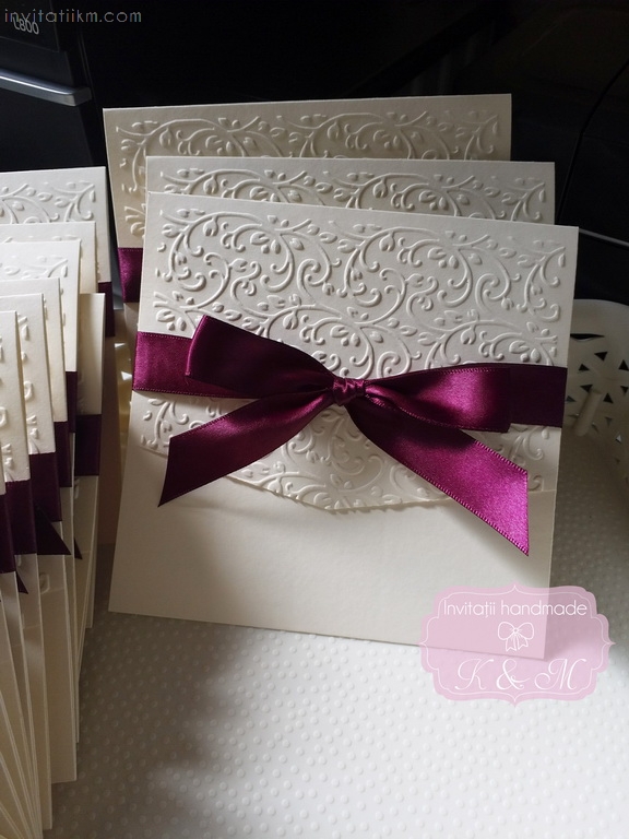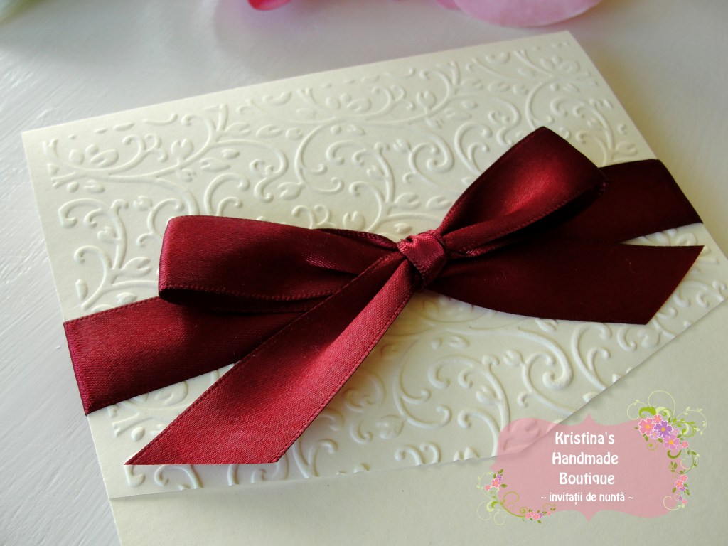 Invitatie handmade realizata din carton ivory embosat si fundita eleganta din satin. Nu necesita plic.