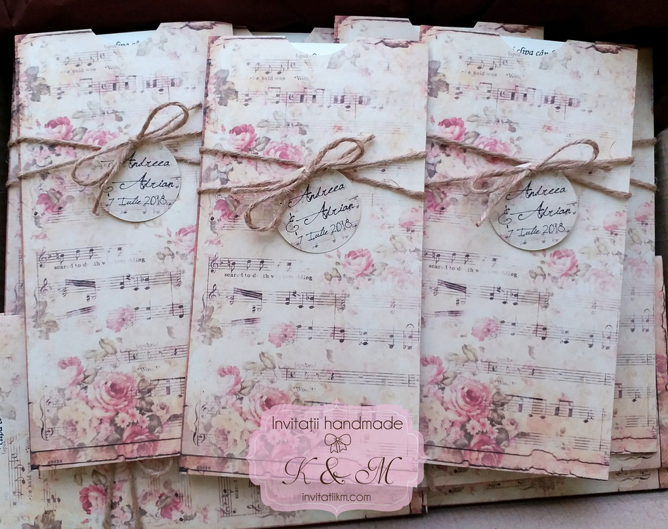 Invitatie in plic vintage cu trandafiri roz si note muzicale si eticheta rotunda cu numele mirilor legata cu sfoara. Nu necesita plic separat. Textul este printat pe carton mat ivory (+0.3 lei pentru text fata-verso)