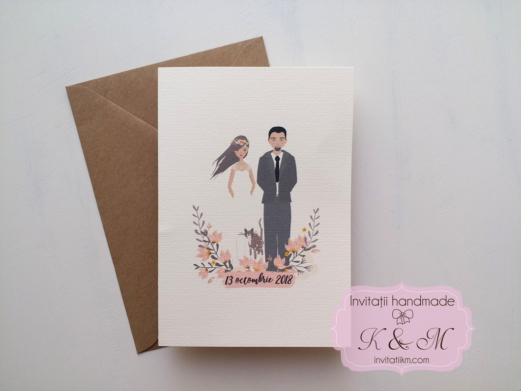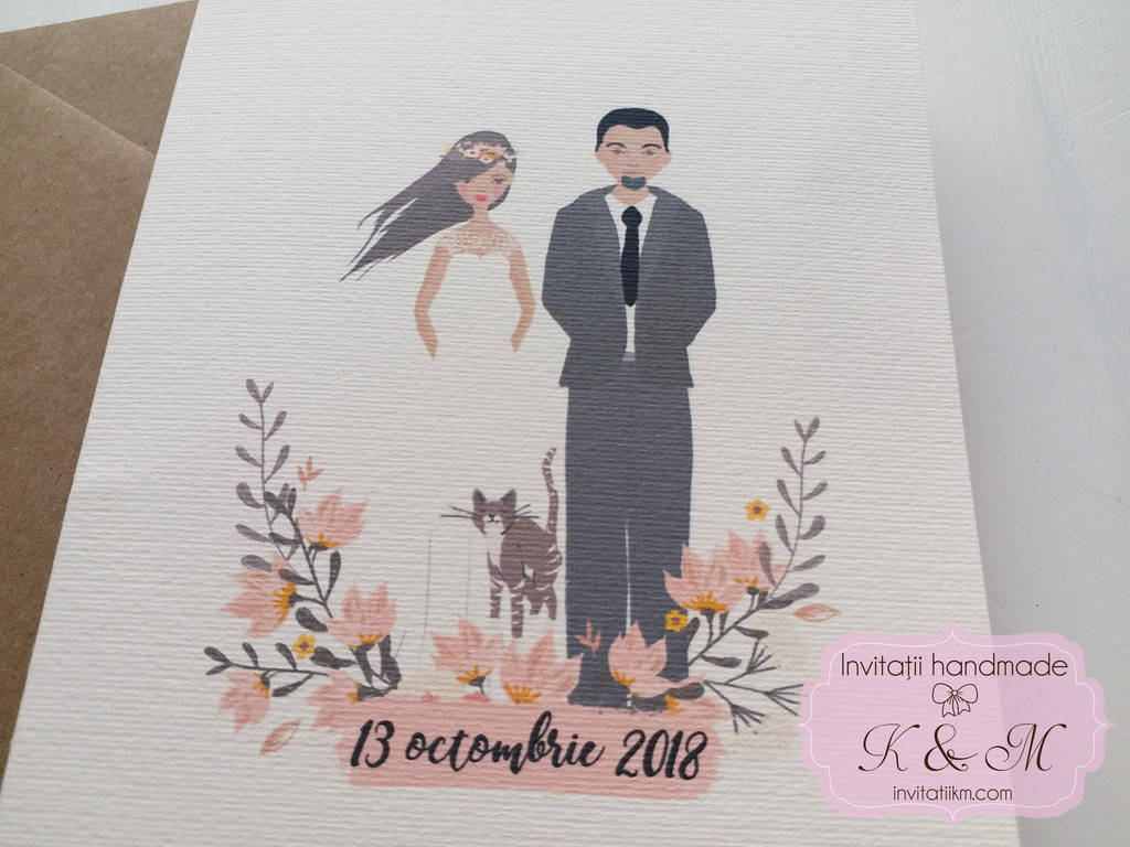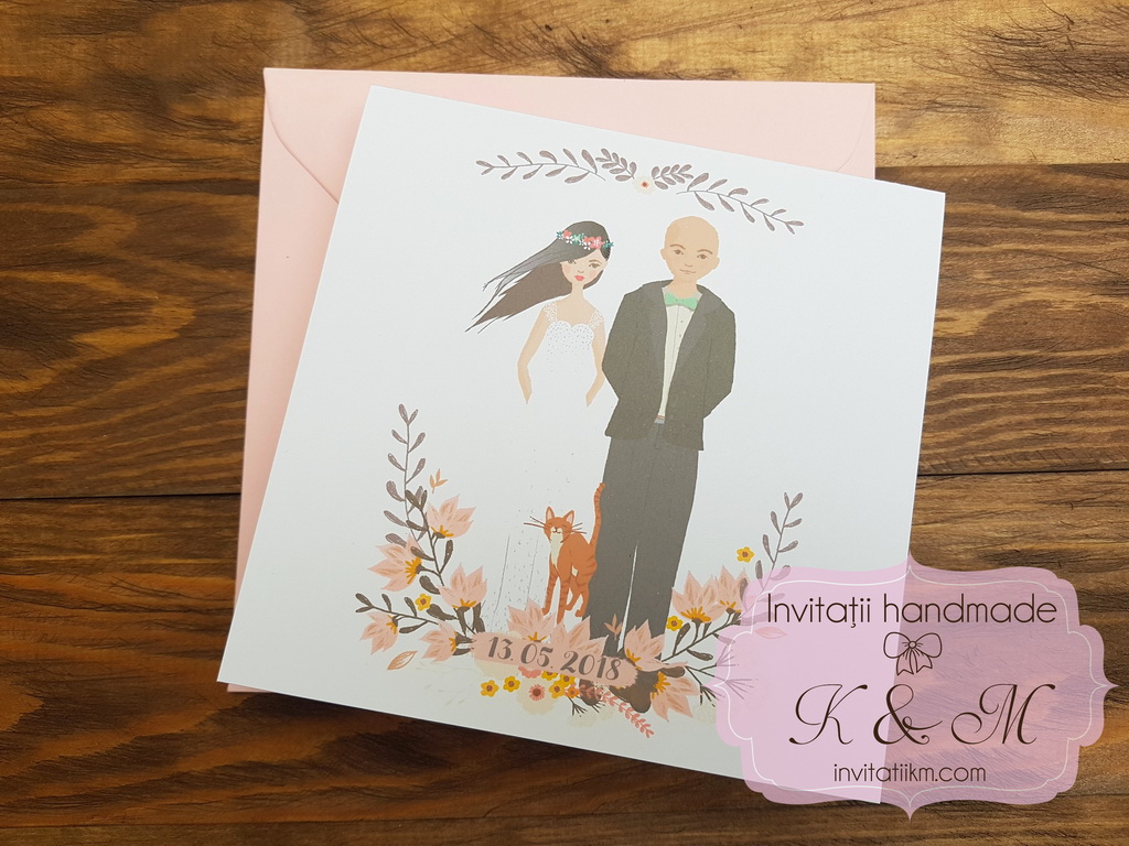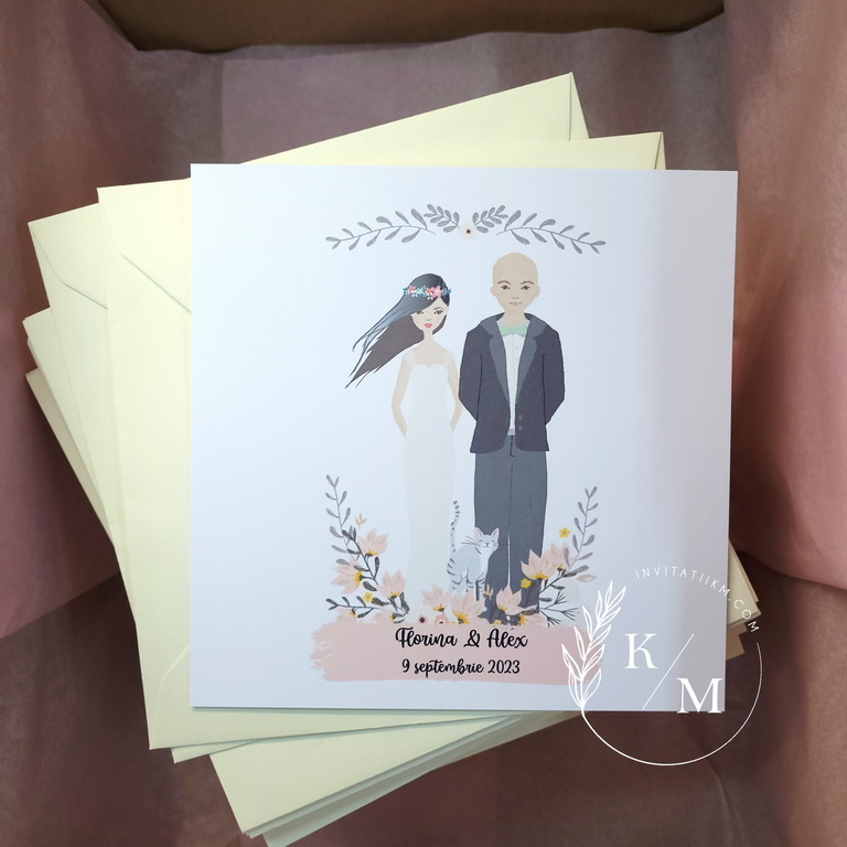 Invitatii de nunta realizate din carton alb/ivory cu flori si portretele mirilor – se pot face mici modificari astfel incat sa semene cu voi (culoare par, culoare ochi, inaltime)