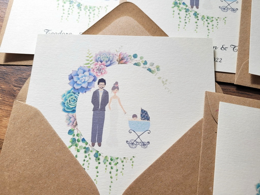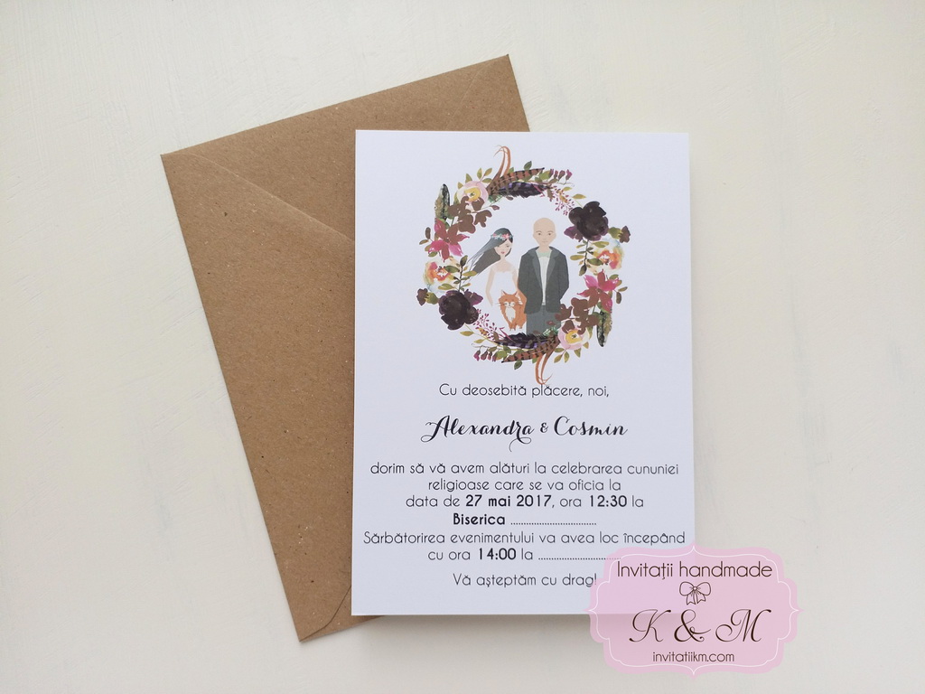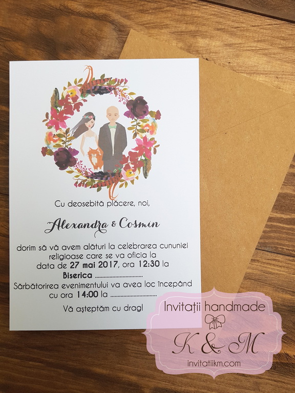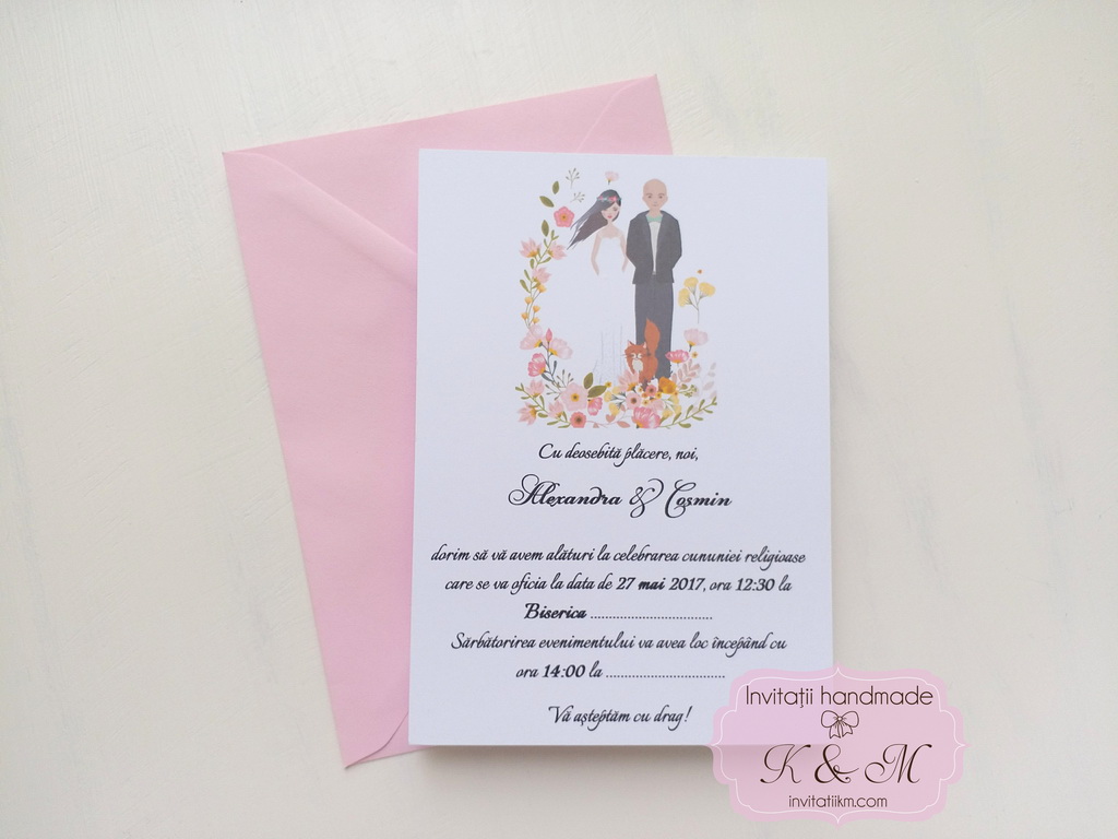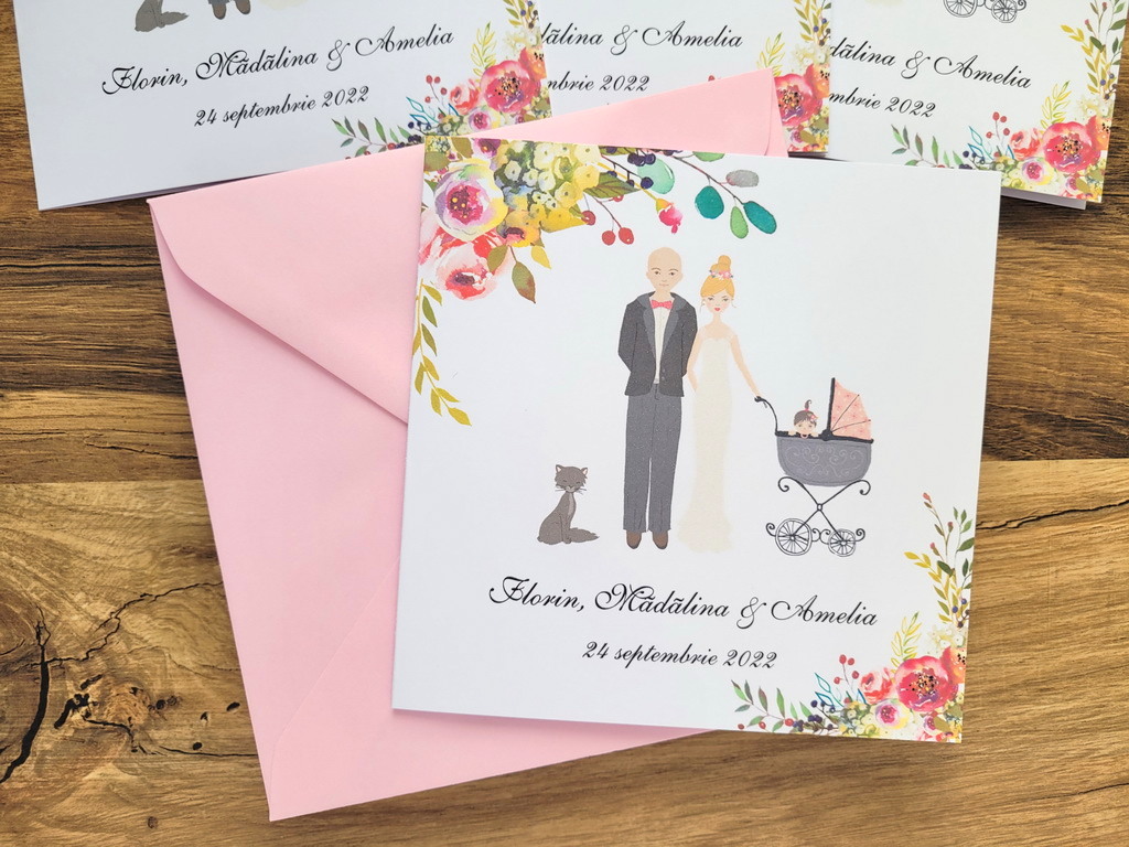 Invitatii de nunta realizate din carton alb/ivory cu flori si portretele mirilor – se pot face mici modificari astfel incat sa semene cu voi (culoare par, culoare ochi, inaltime)