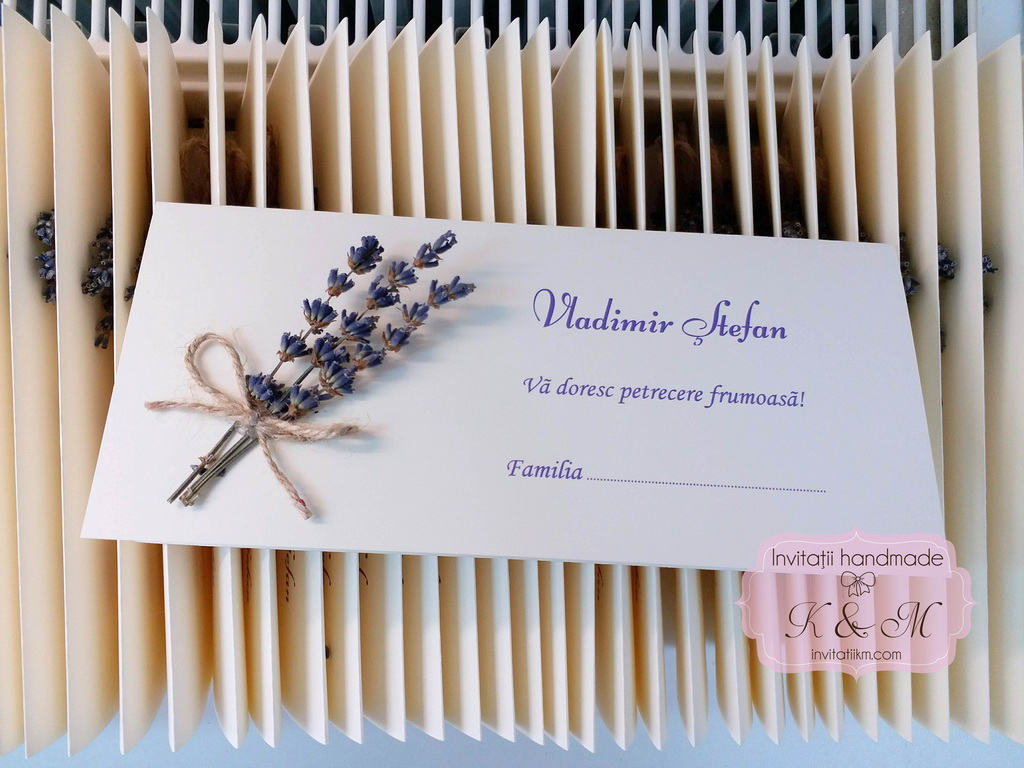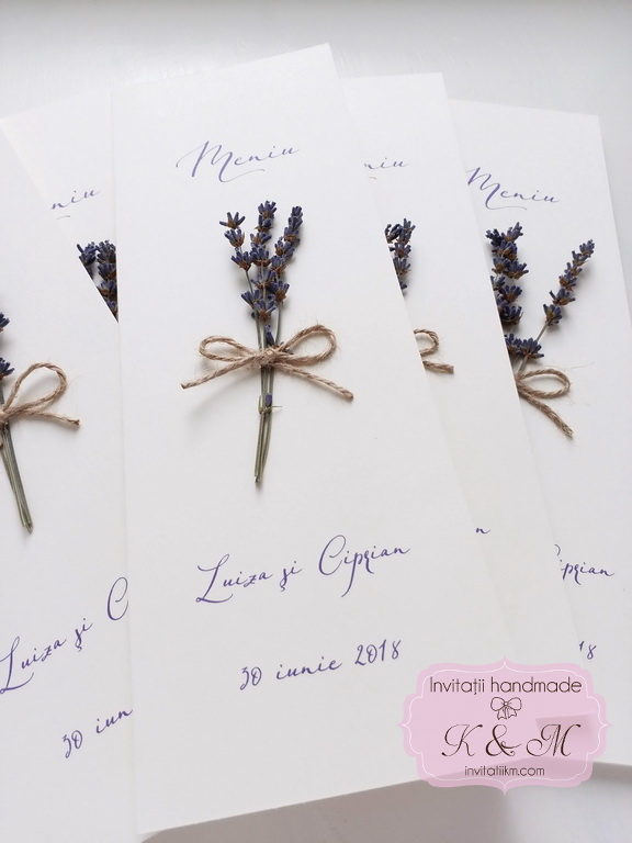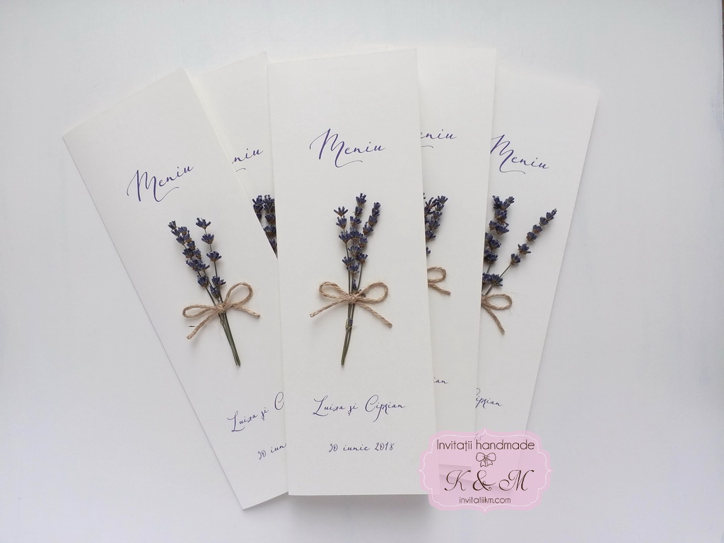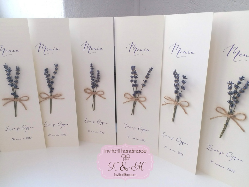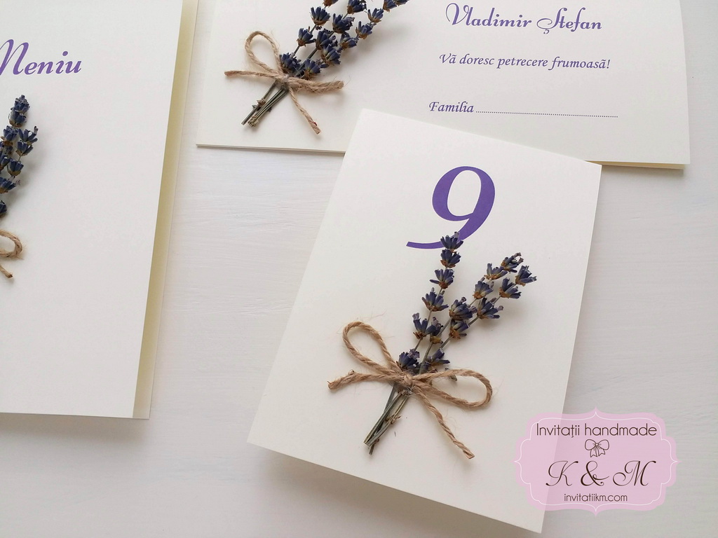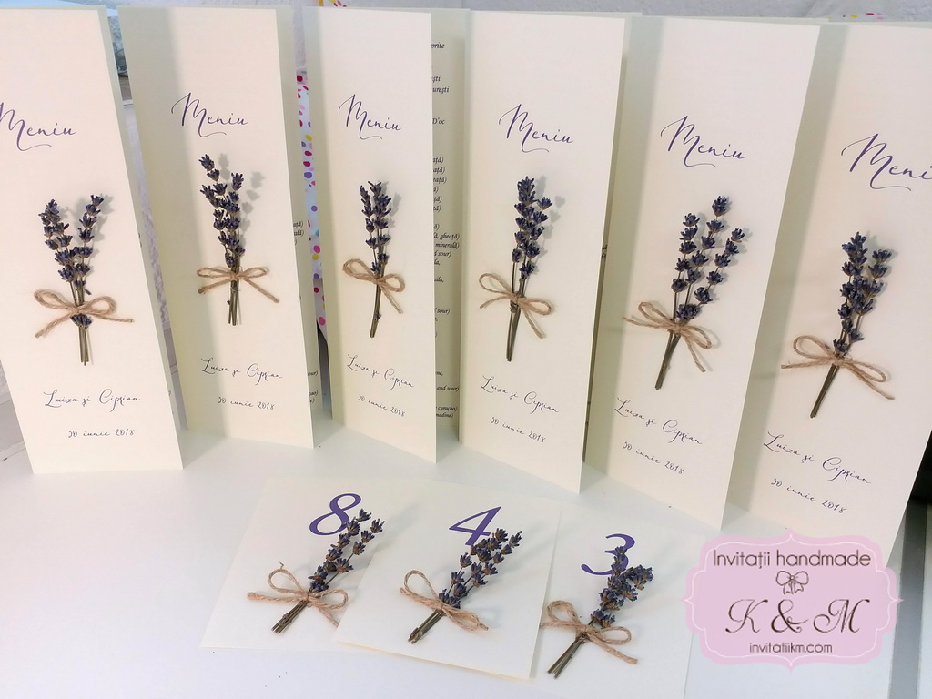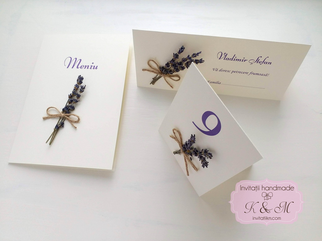 Meniu, numar masa si plic de bani/card de asezare handmade cu buchete de lavanda uscata si sfoara