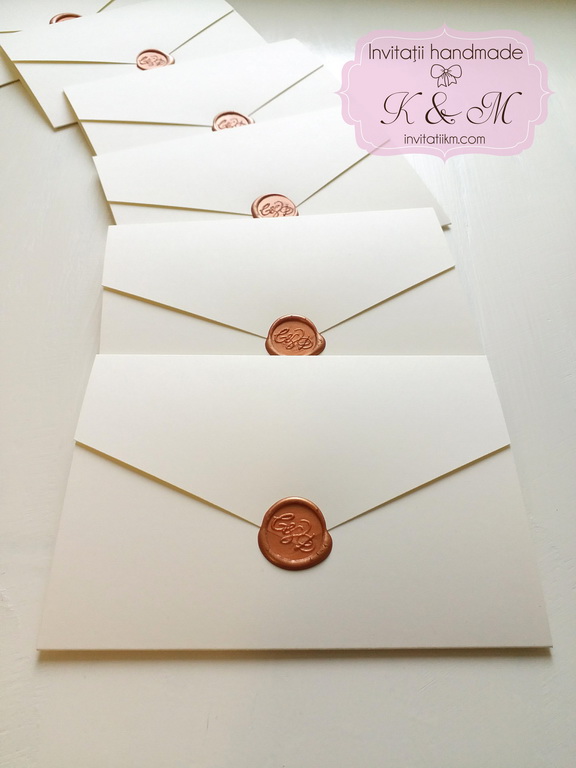 Invitatie de nunta realizata manual din carton gros ivory, clapeta in V si sigiliu. Nu necesita plic. Sigiliul poate fi personalizat cu initialele mirilor (contra cost).