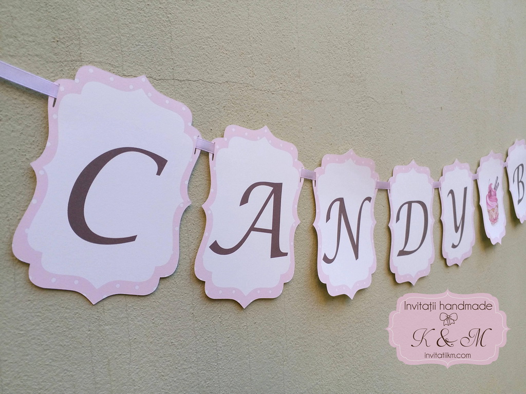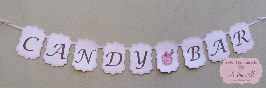Ghirlanda pentru candy bar pentru nunta sau botez cu contur roz cu buline albe si briosa roz