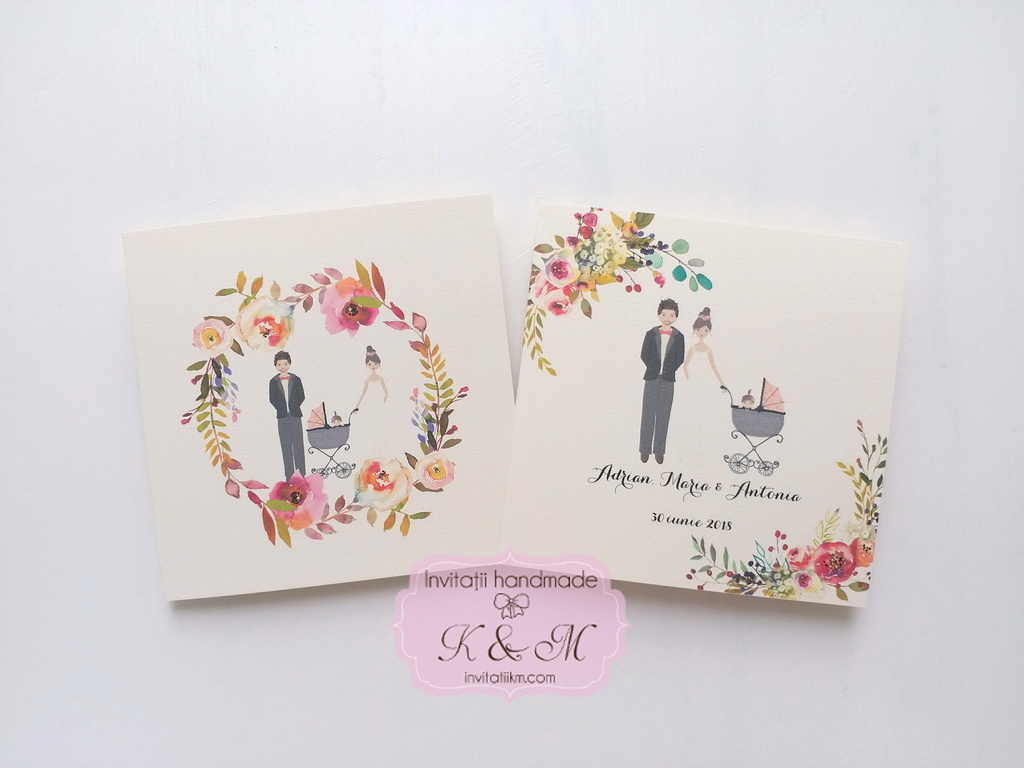 Invitatii de nunta si botez cu miri si bebelus in carucior – se pot face modificari astfel incat sa semene cu voi 🙂