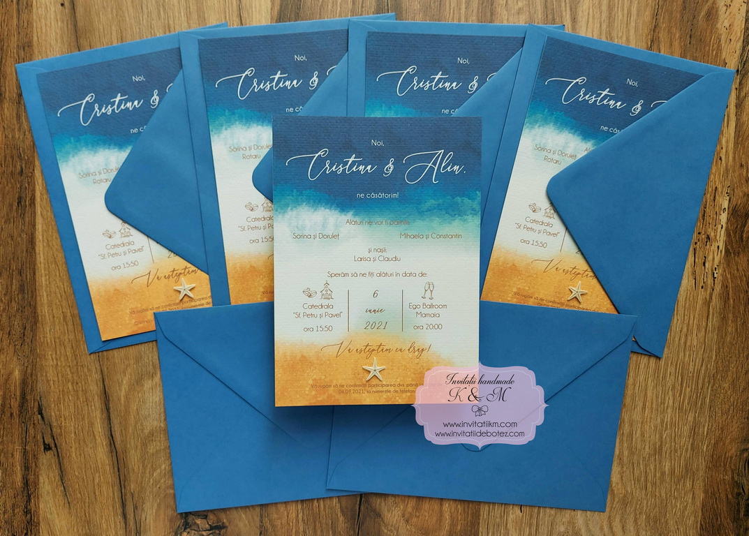 Invitatii de nunta realizate din carton alb texturat, print stil acuarela si stelute de mare lipite bine 🙂