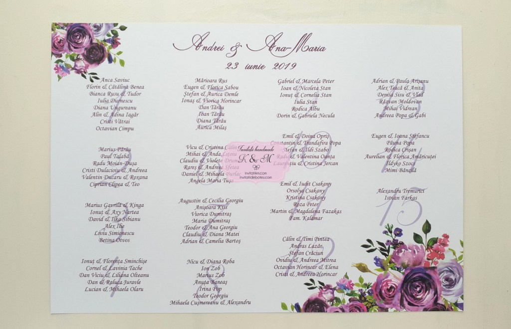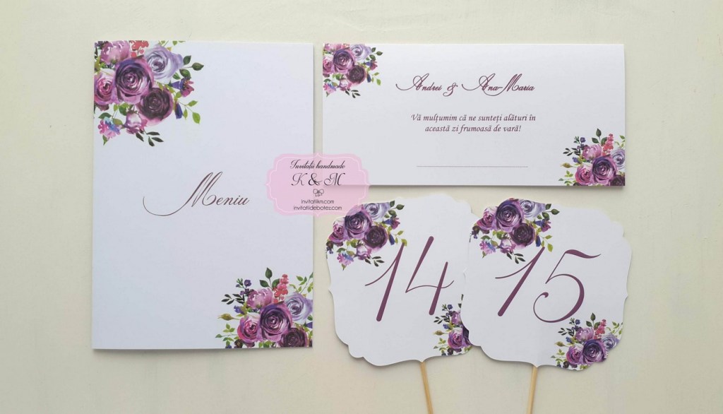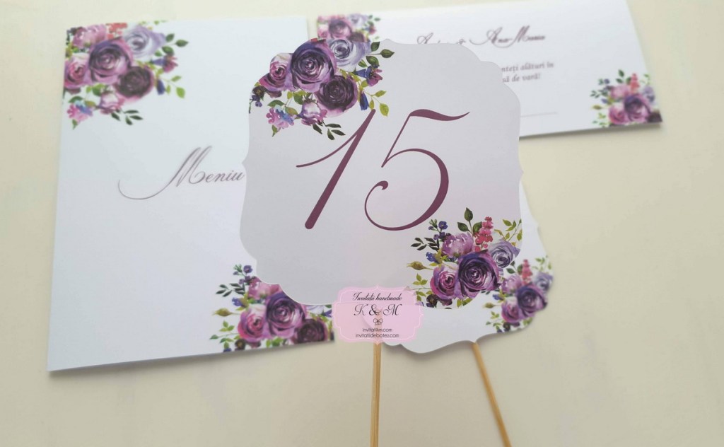 Meniu, numar masa si plic de bani/card de asezare cu flori mov si lila
