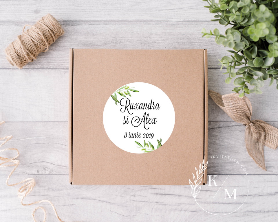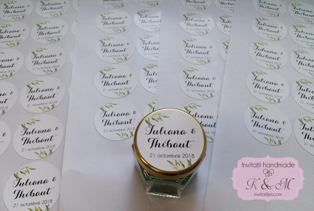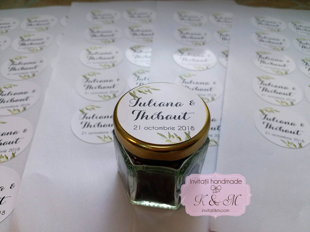 Etichete realizate din carton alb autocolant lucios, rezistent la umezeala (nu se sterge textul) – pot fi personalizate dupa preferinte. Pot fi folosite pentru marturii (borcane miere, sticle vin, sticle tuica etc), cosmetice sau orice alte produse care necesita etichetare