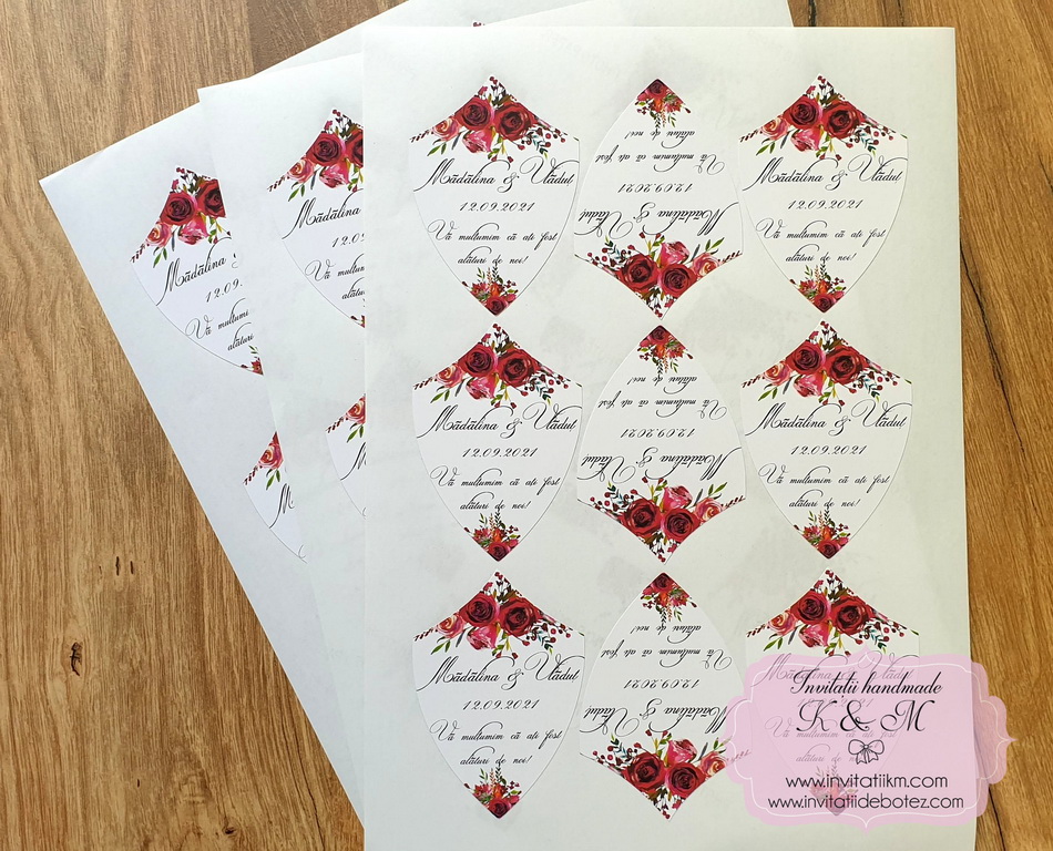Etichete autoadezive pentru marturii/sticle de vin/tuica realizate din autocolant lucios, rezistent la umezeala (nu se sterge textul) – ele pot fi personalizate dupa preferinte
