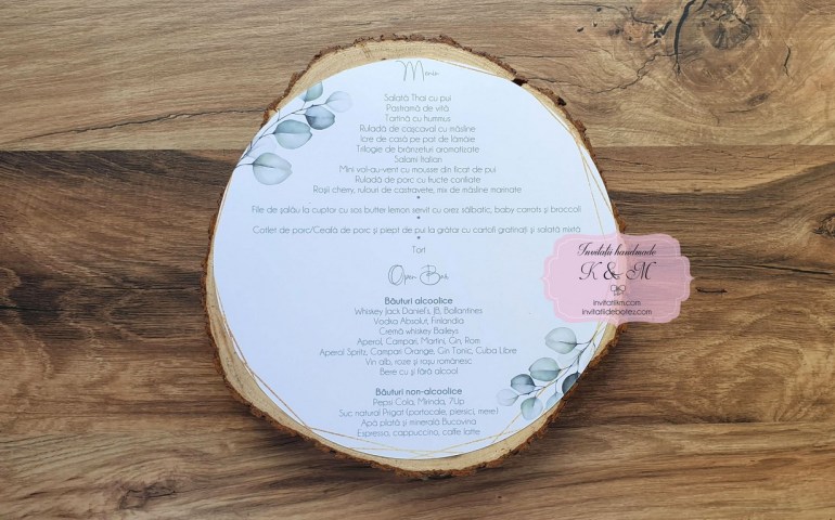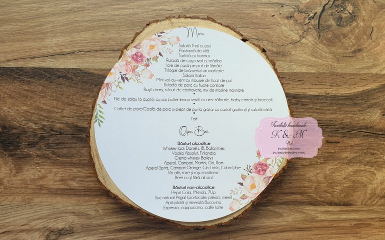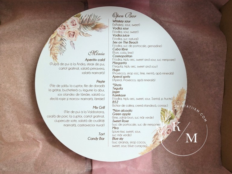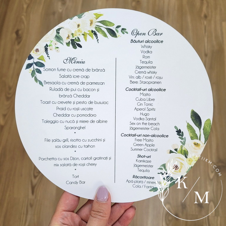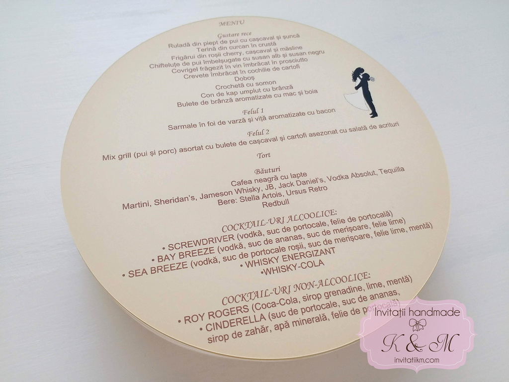 Meniuri individuale rotunde pentru nunta/botez realizate din carton. Meniul poate fi asezat pe fiecare farfurie