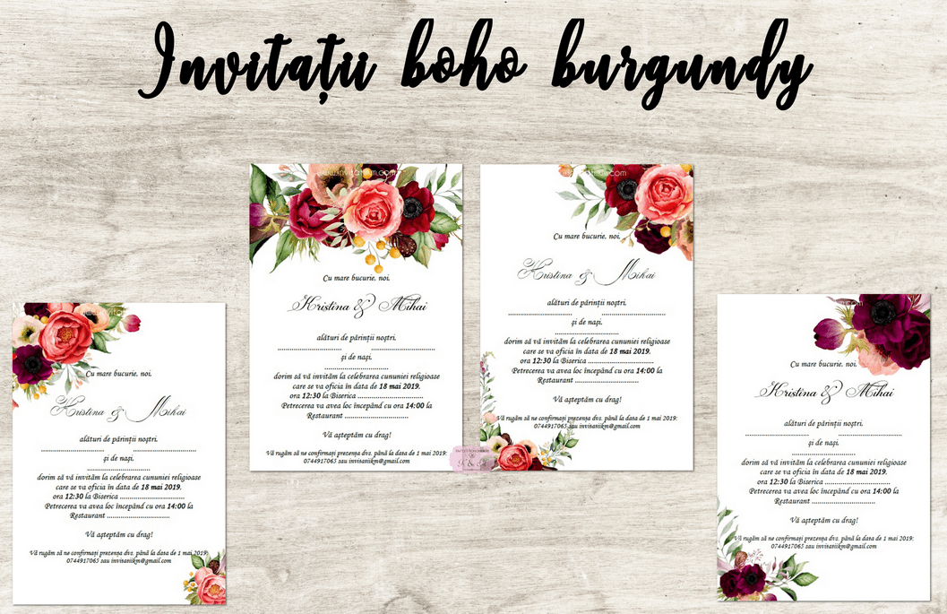 Invitatii de nunta cu flori burgundy, in stil boho, cu plicuri asortate