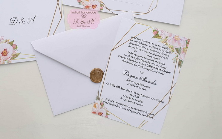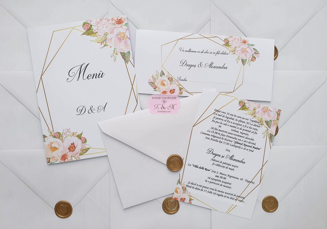 Invitatii de nunta cu bujori roz delicati si plicuri asortate