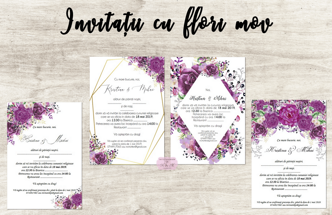 Invitatii de nunta cu flori mov de diferite nuante si plicuri asortate