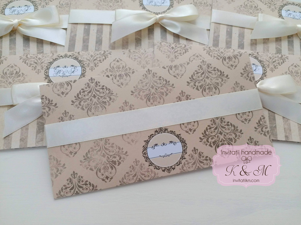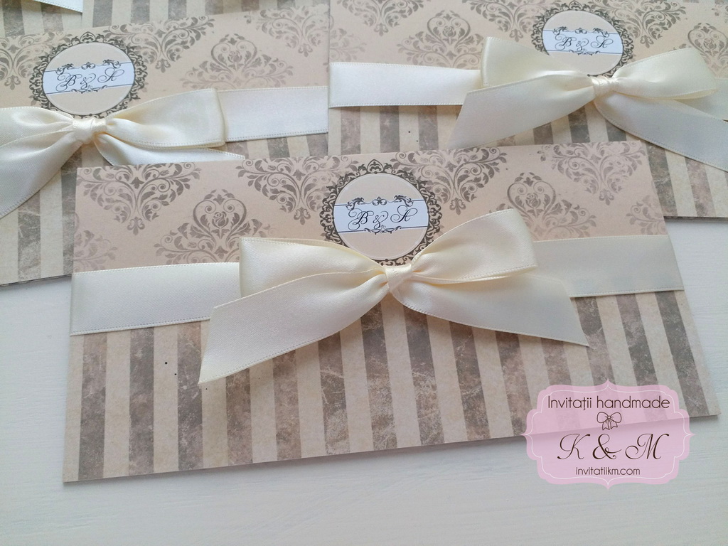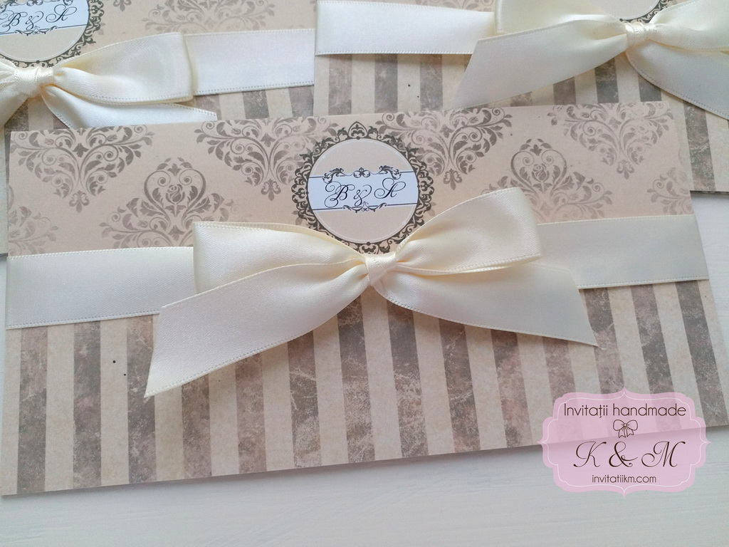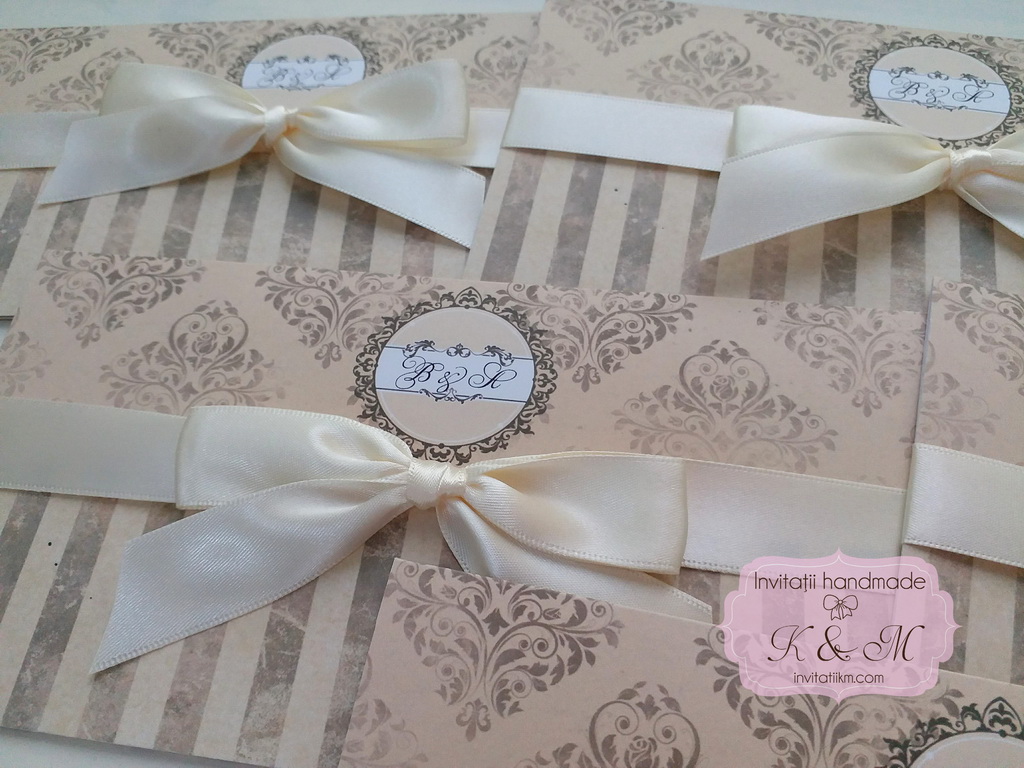 Invitatii de nunta elegante in stil vintage, cu diverse imprimeuri, legate cu fundite satinate. Nu au si nu necesita plic