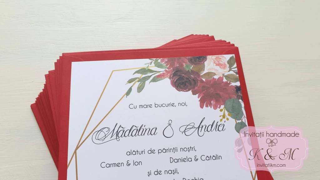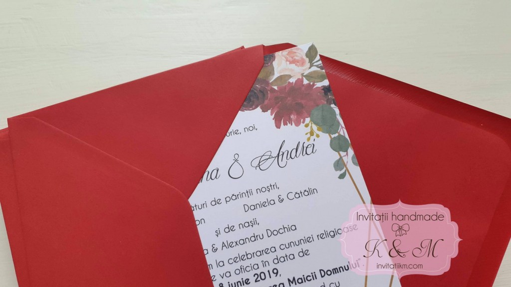 Invitatii de nunta cu flori burgundy si verdeata si plicuri asortate