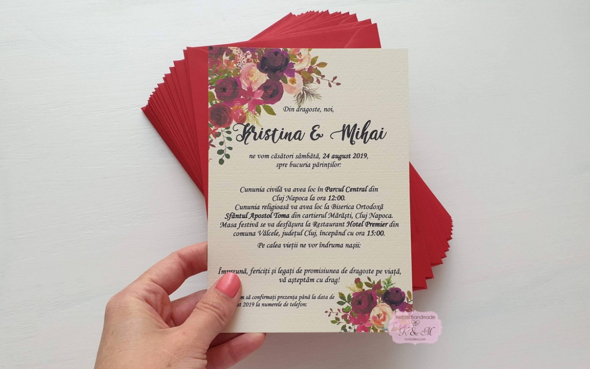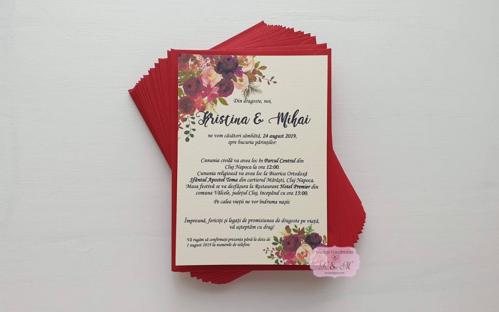 Invitatii de nunta cu flori bordeaux realizate din carton crem texturat si plicuri asortate