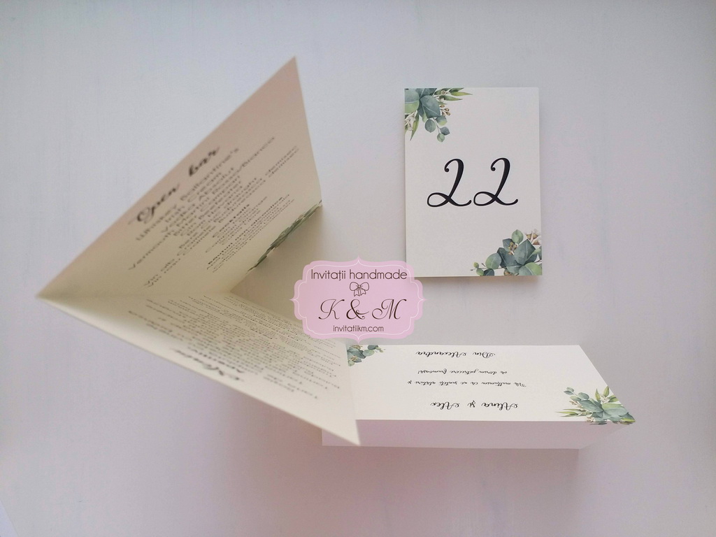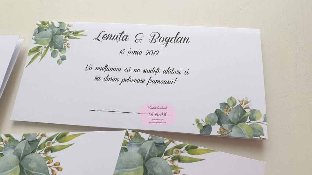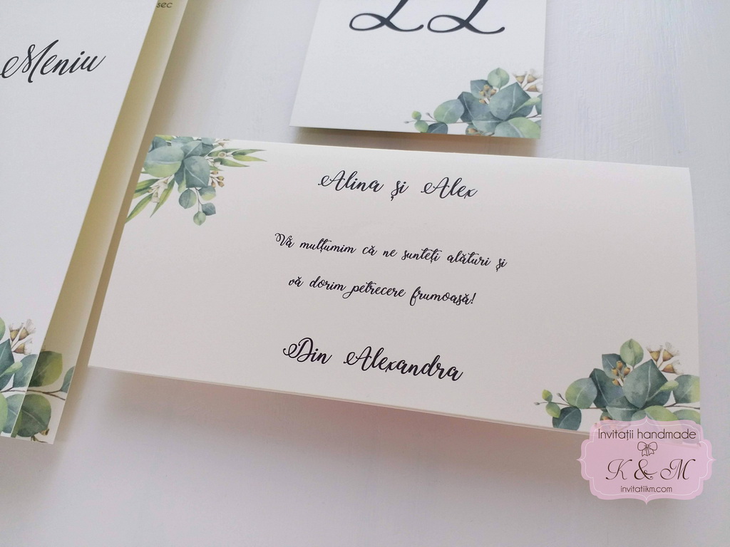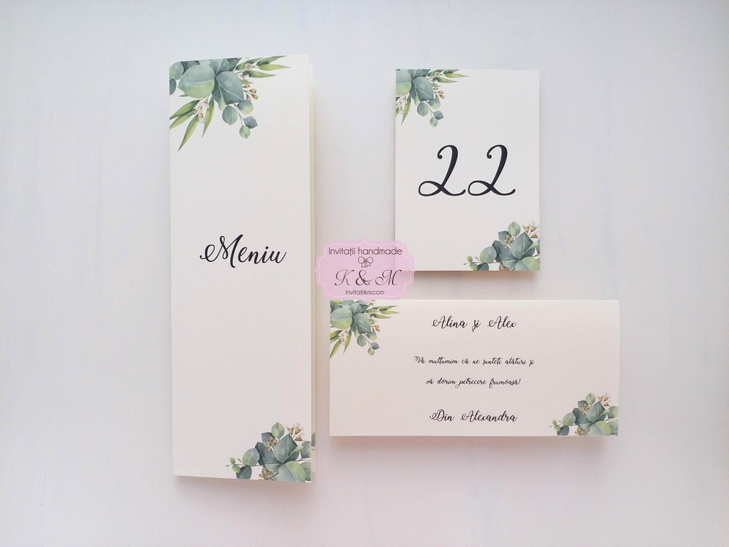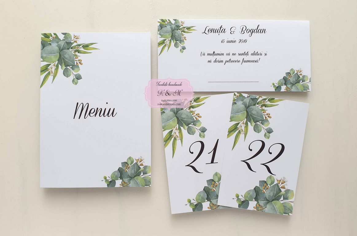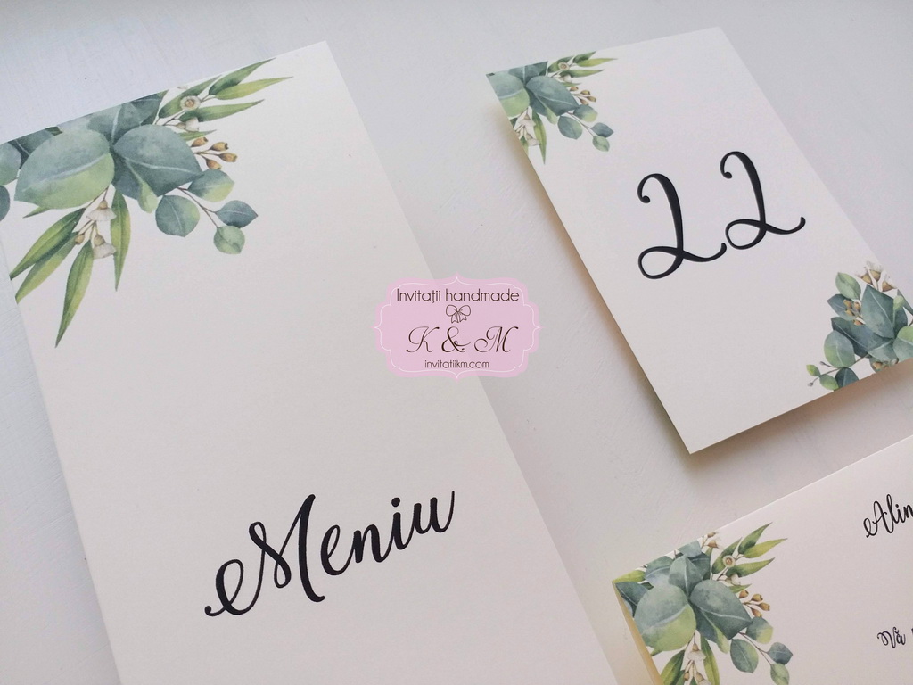 Meniu, numar masa si plic de bani/card de asezare cu frunze de eucalipt