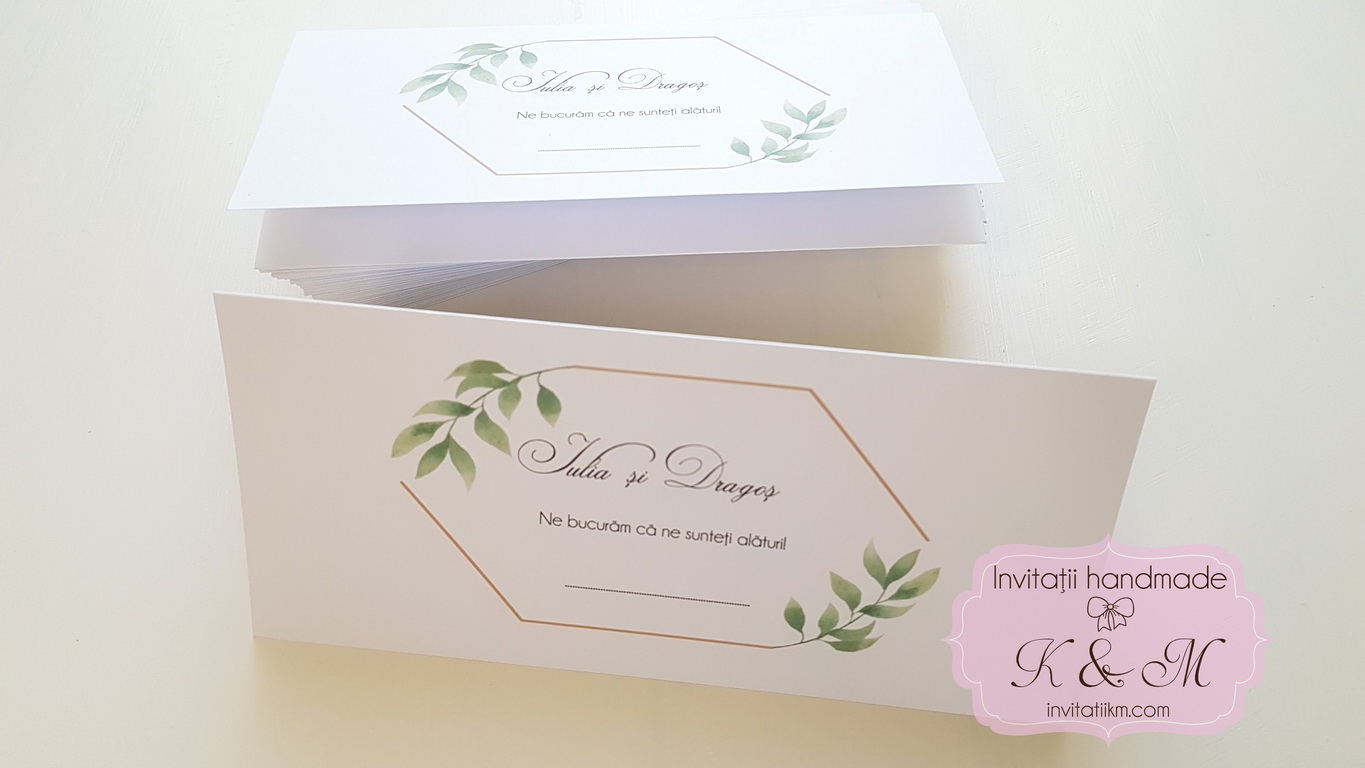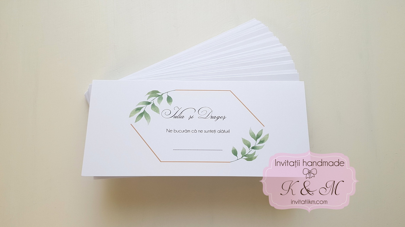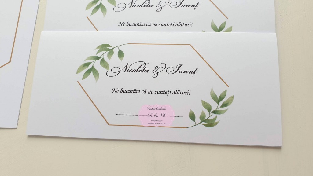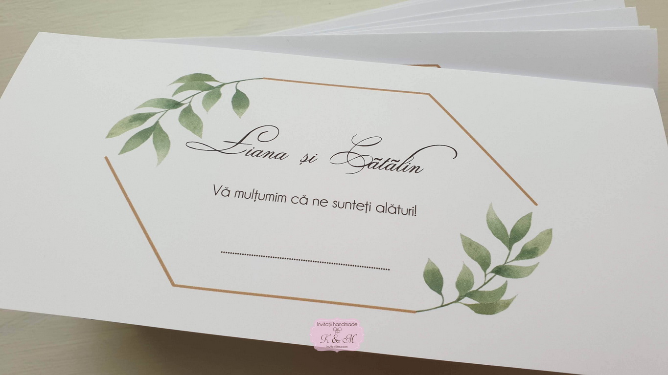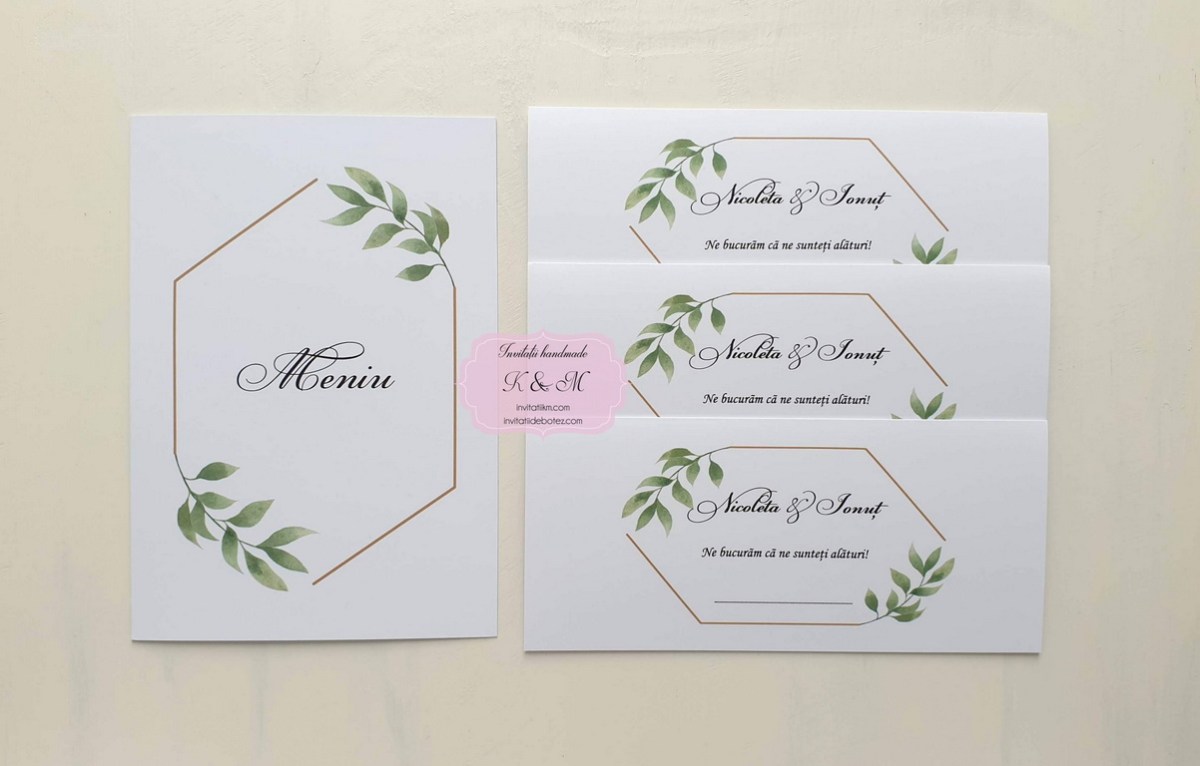 Meniu si plic de bani/card de asezare cu chenar auriu geometric si frunze verzi