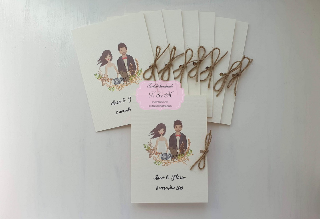 Invitatii de nunta realizate din carton cu frunze si portretele mirilor – acestea se pot personaliza in asa fel incat sa semene cu voi; de asemenea, se pot adauga si caini/pisici/cai/alte animalute (* contra cost)