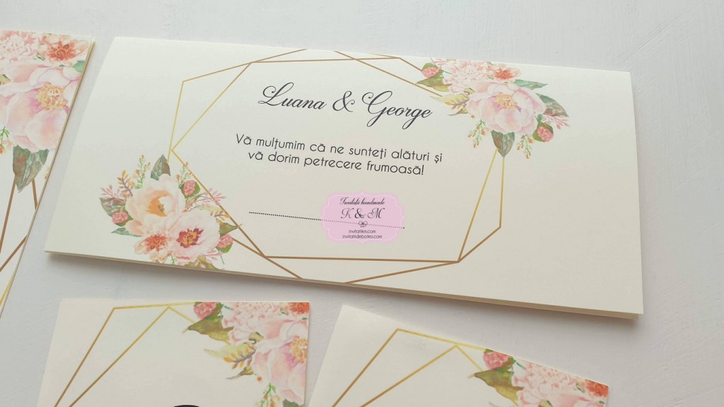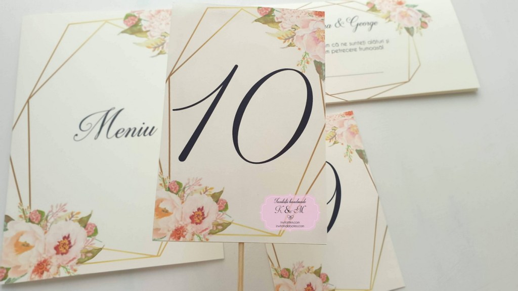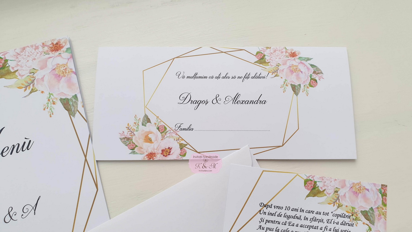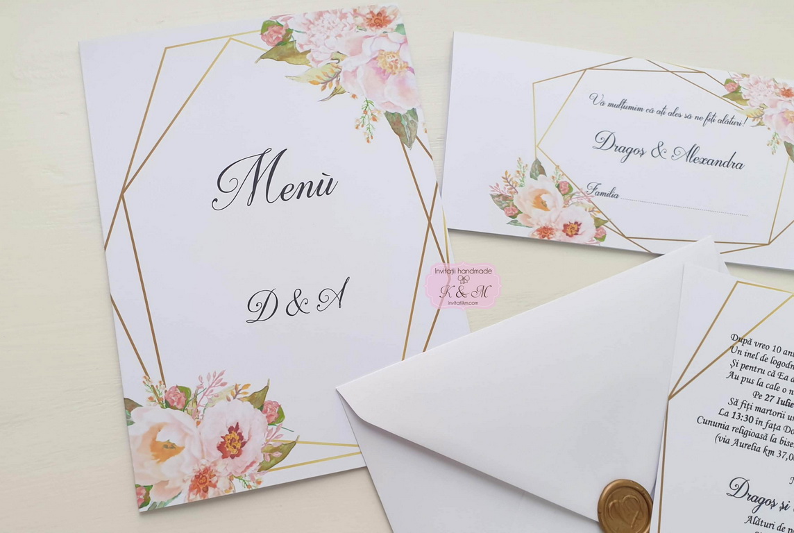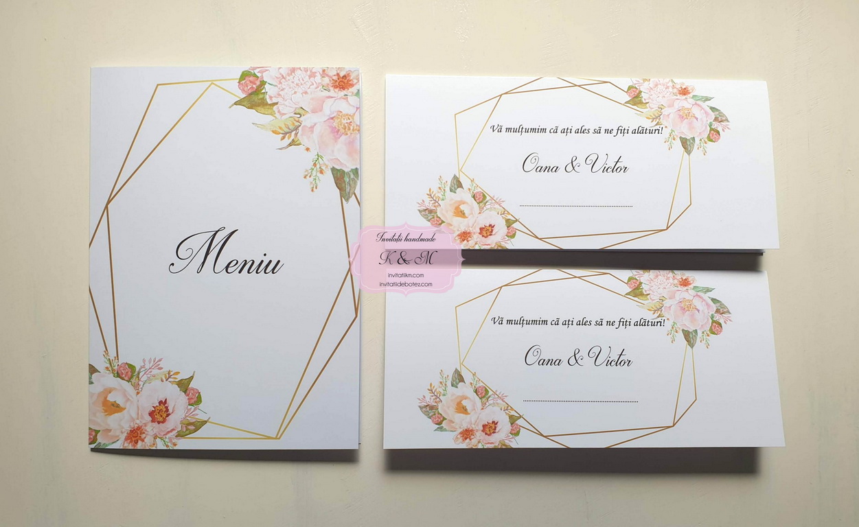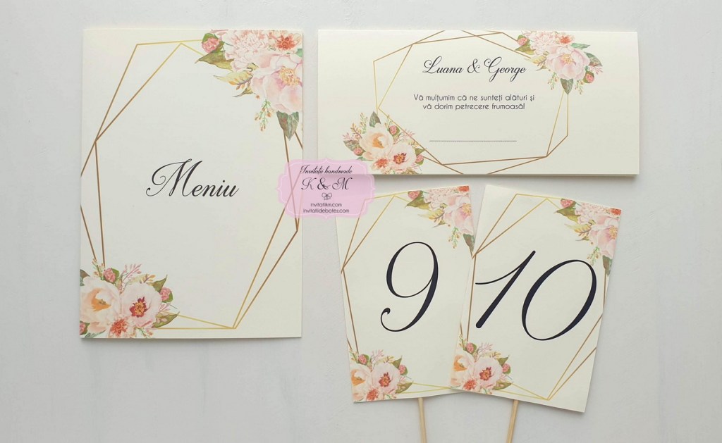 Meniu, plic de bani/card de asezare si numar de masa cu chenar auriu si bujori roz