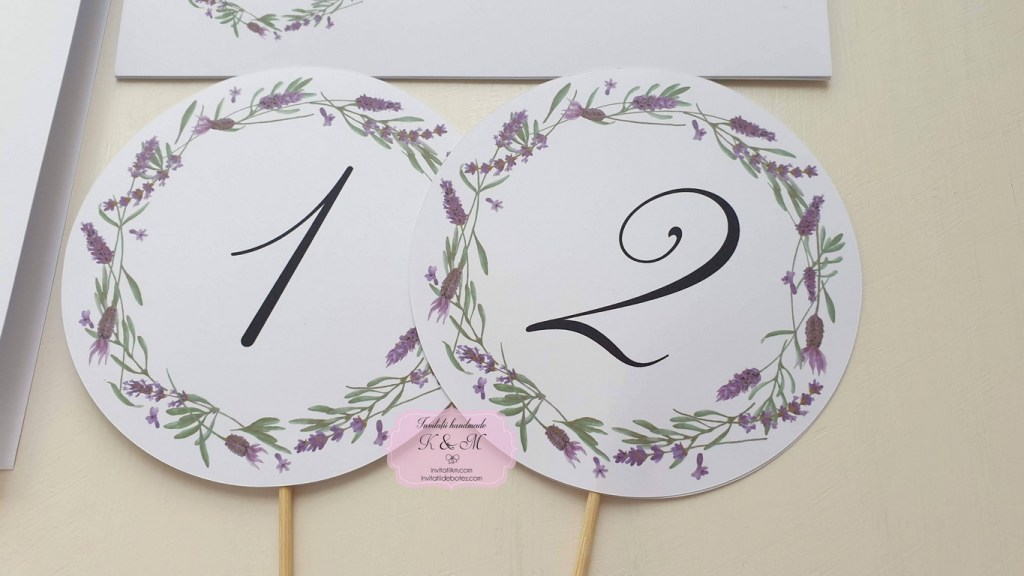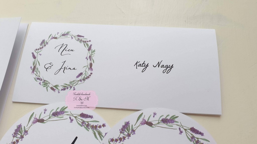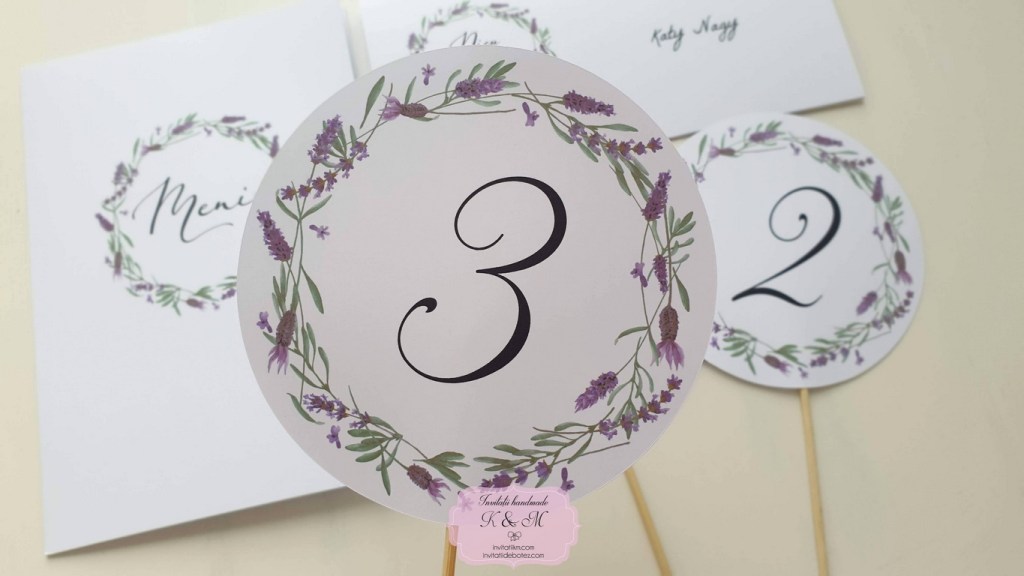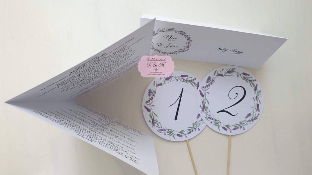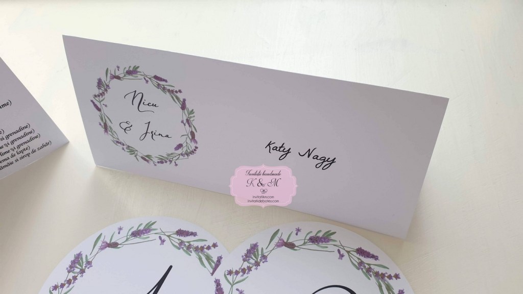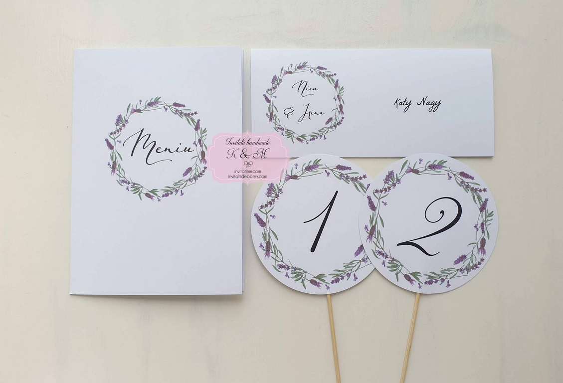 Meniu, plic de bani/card de asezare si numar de masa cu coronita din lavanda