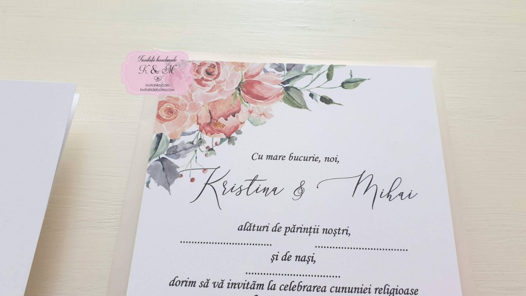 Invitatie, meniu si plic de bani/card de asezare cu flori roz