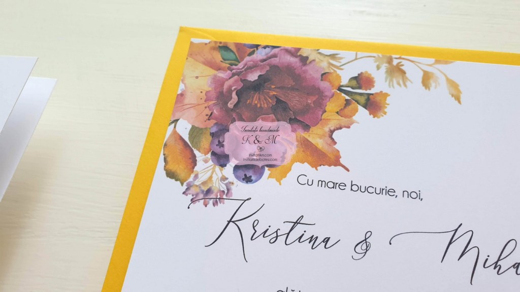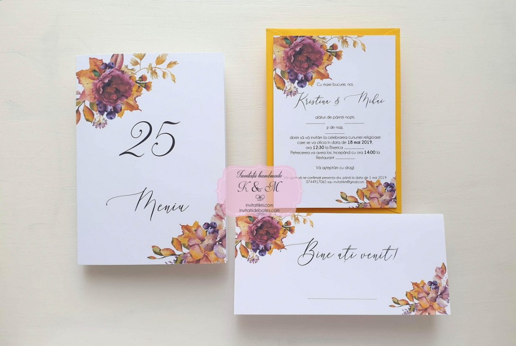 Invitatie, meniu si plic de bani/card de asezare cu flori si frunze de toamna