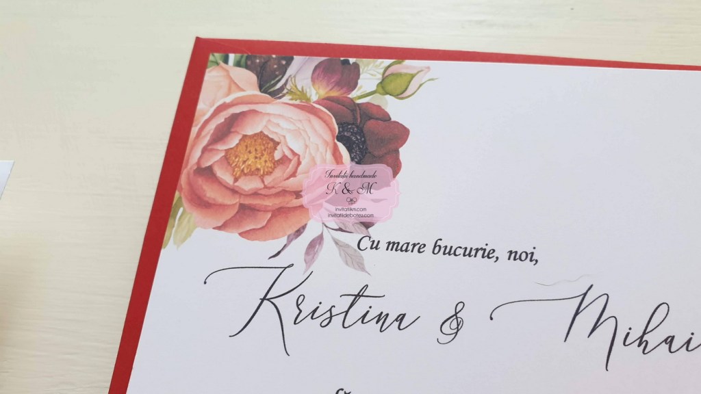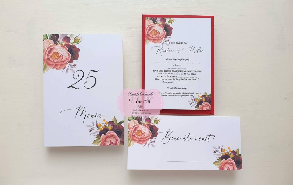 Invitatie, meniu si plic de bani/card de asezare cu flori grena
