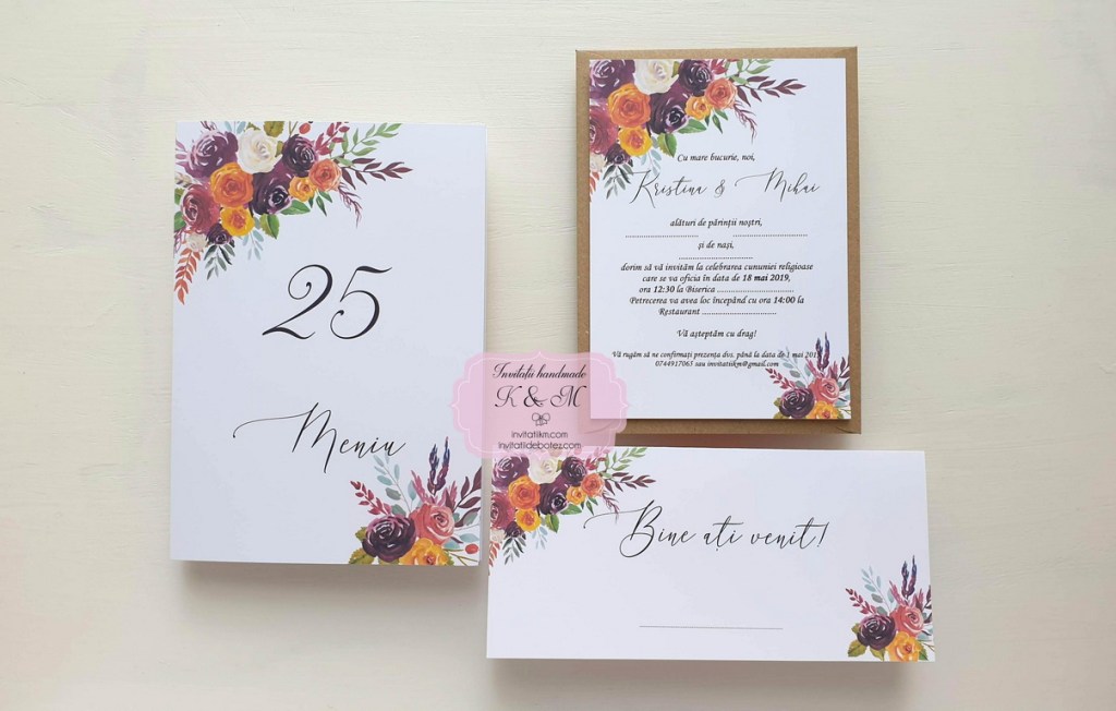Invitatii, meniuri, plicuri de bani de nunta cu flori si frunze de toamna cod 180