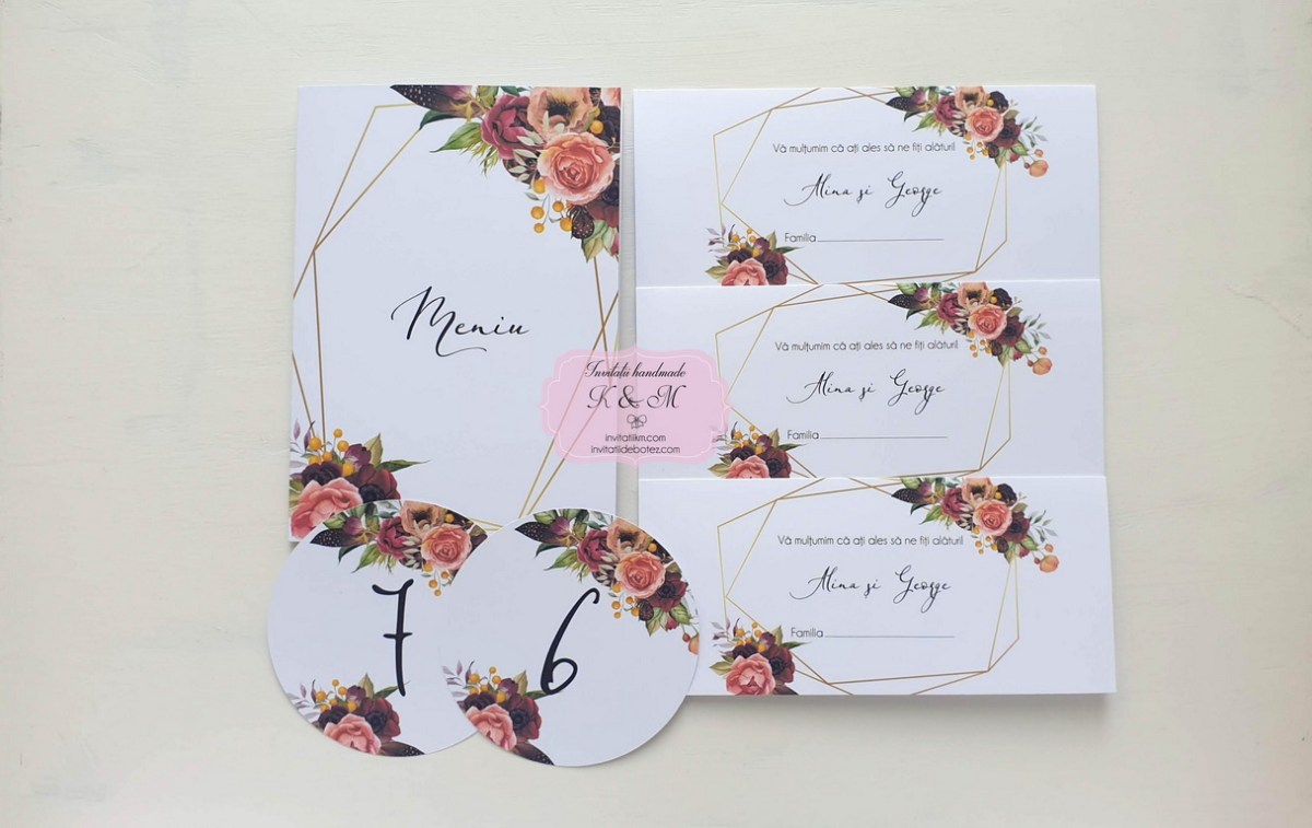 Meniu, numar masa si plic de bani/card de asezare cu flori burgundy