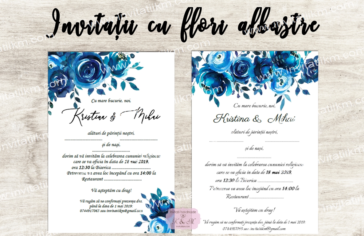 Invitatii de nunta cu flori albastre si plicuri asortate
