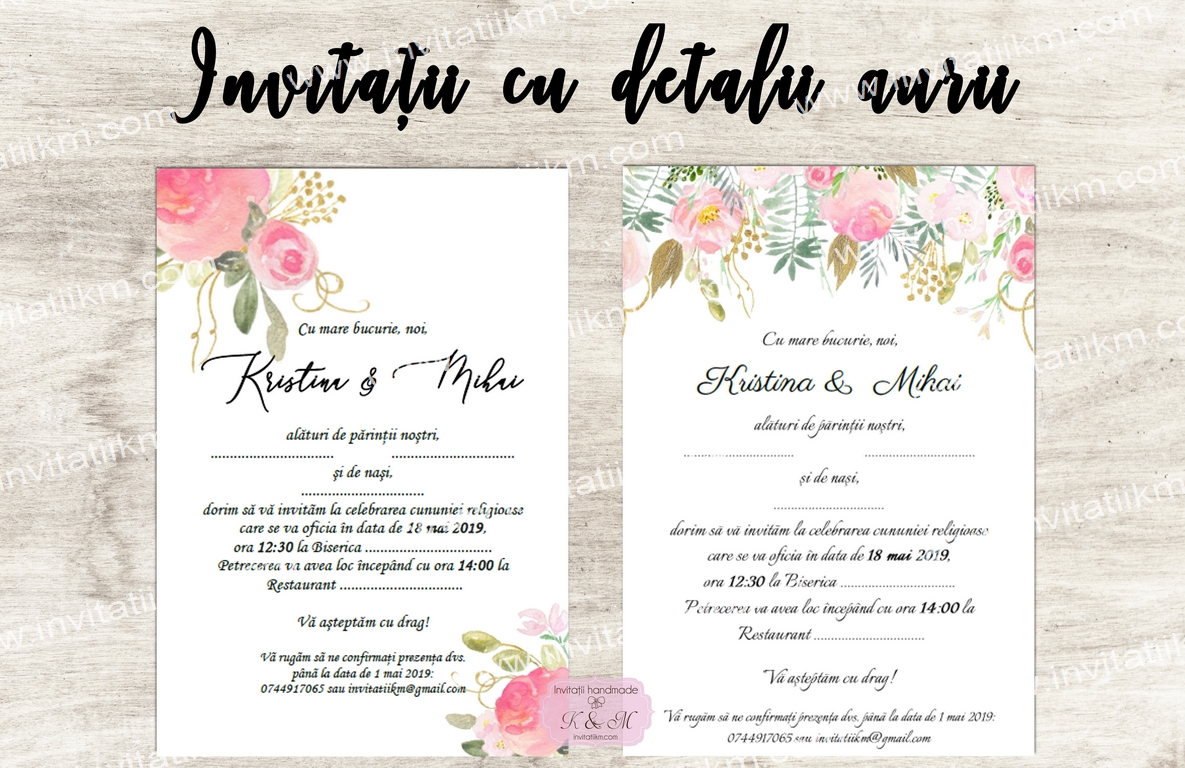 Invitatii de nunta cu flori roz si detalii aurii si plicuri asortate (detaliile aurii sunt doar printate, nu metalizate)