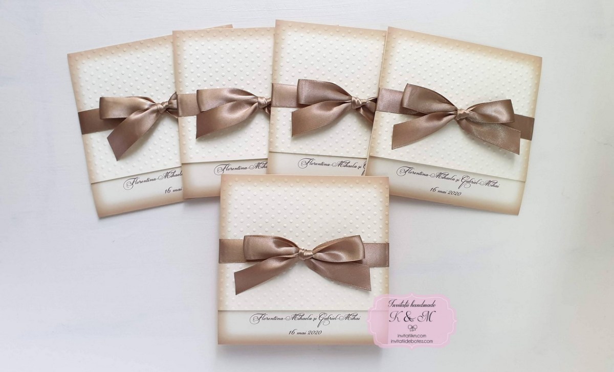 Invitatie handmade realizata din carton embosat si fundita eleganta din satin. Nu necesita plic.