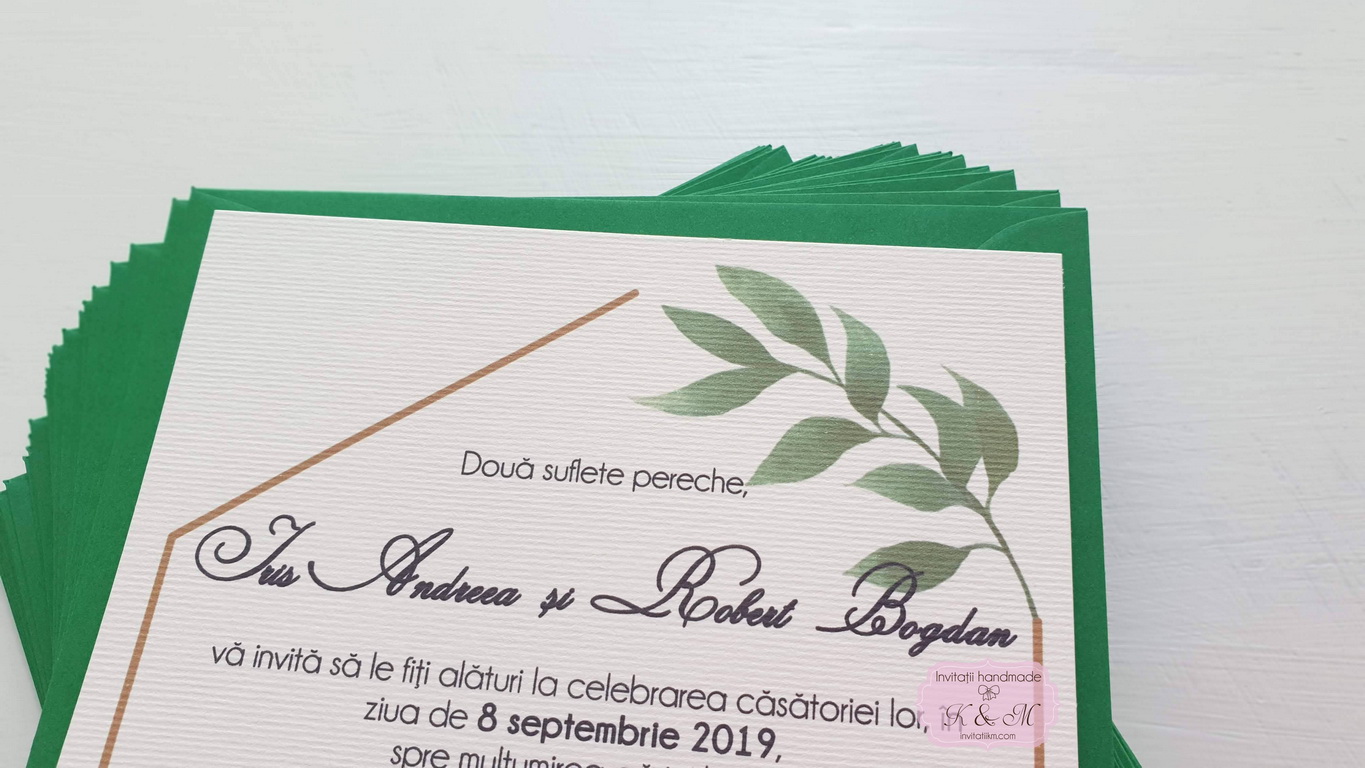 Invitatie de nunta realizata din carton gros alb mat cu plic colorat personalizat cu liner in acelasi ton cu invitatia
