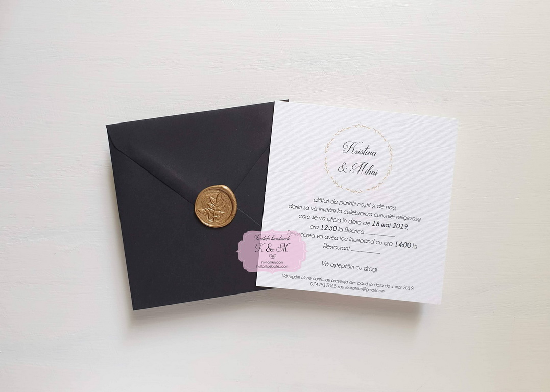 Invitatii de nunta realizate din carton gros neted/texturat, detalii aurii (auriul este mat, printat, nu lucios) si plicuri asortate, inchise cu sigiliu din ceara