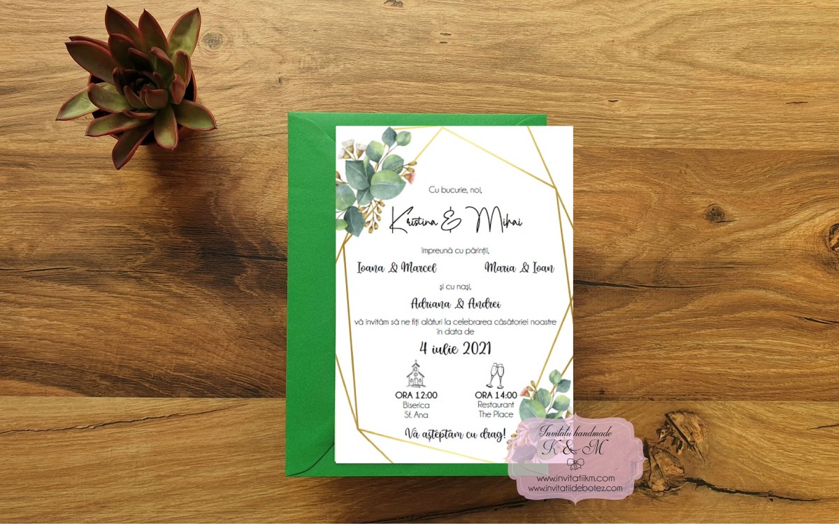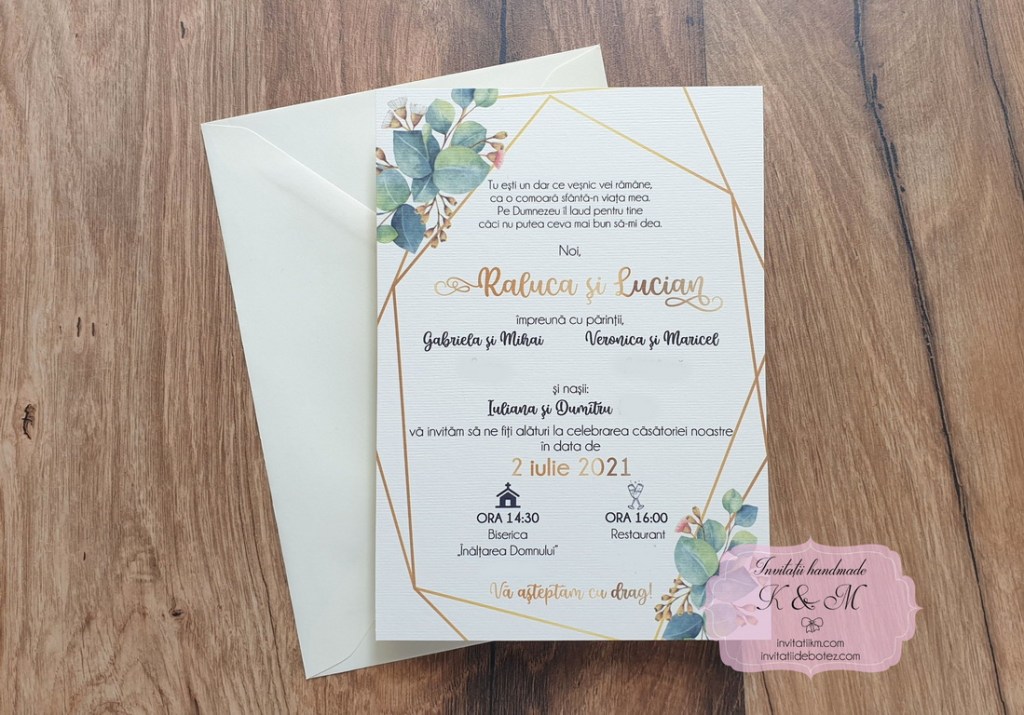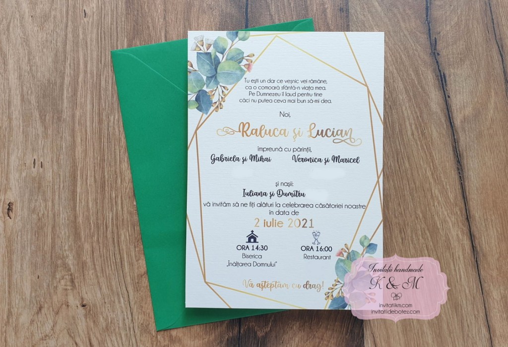 Invitatii de nunta cu chenar geometric, frunze de eucalipt si plicuri asortate