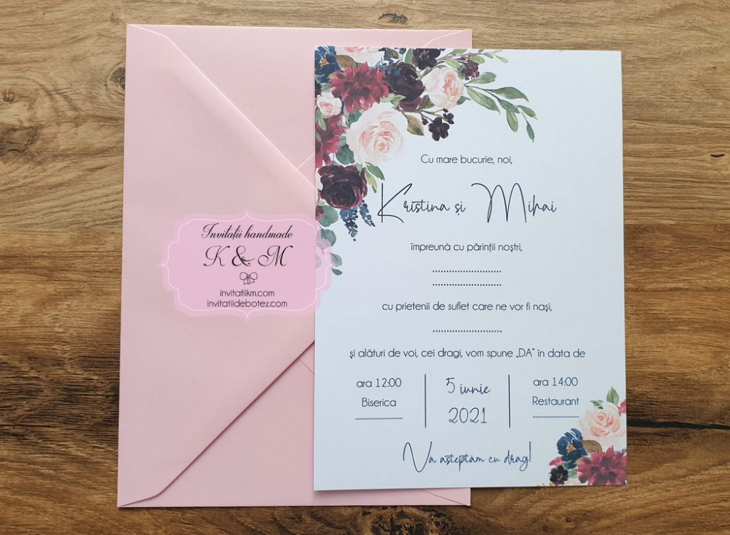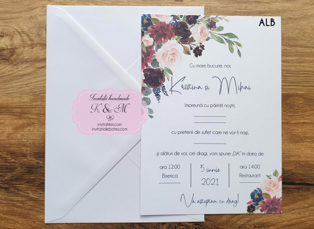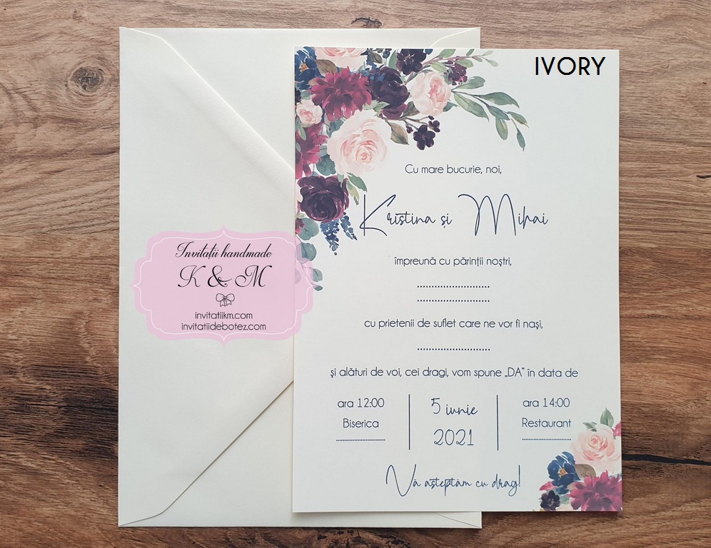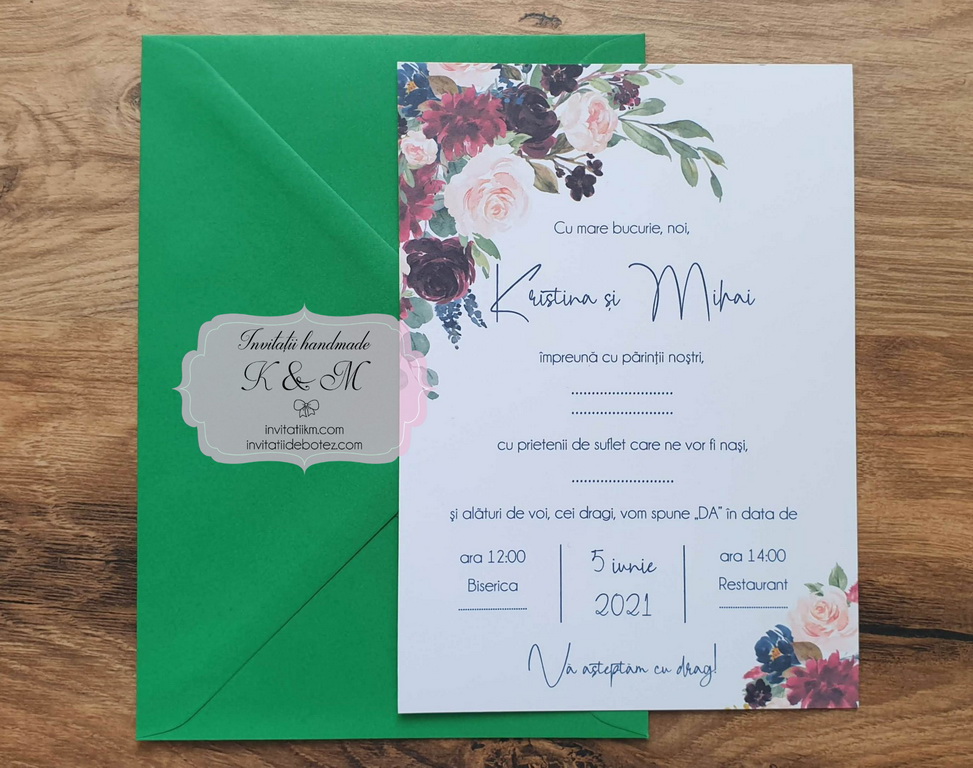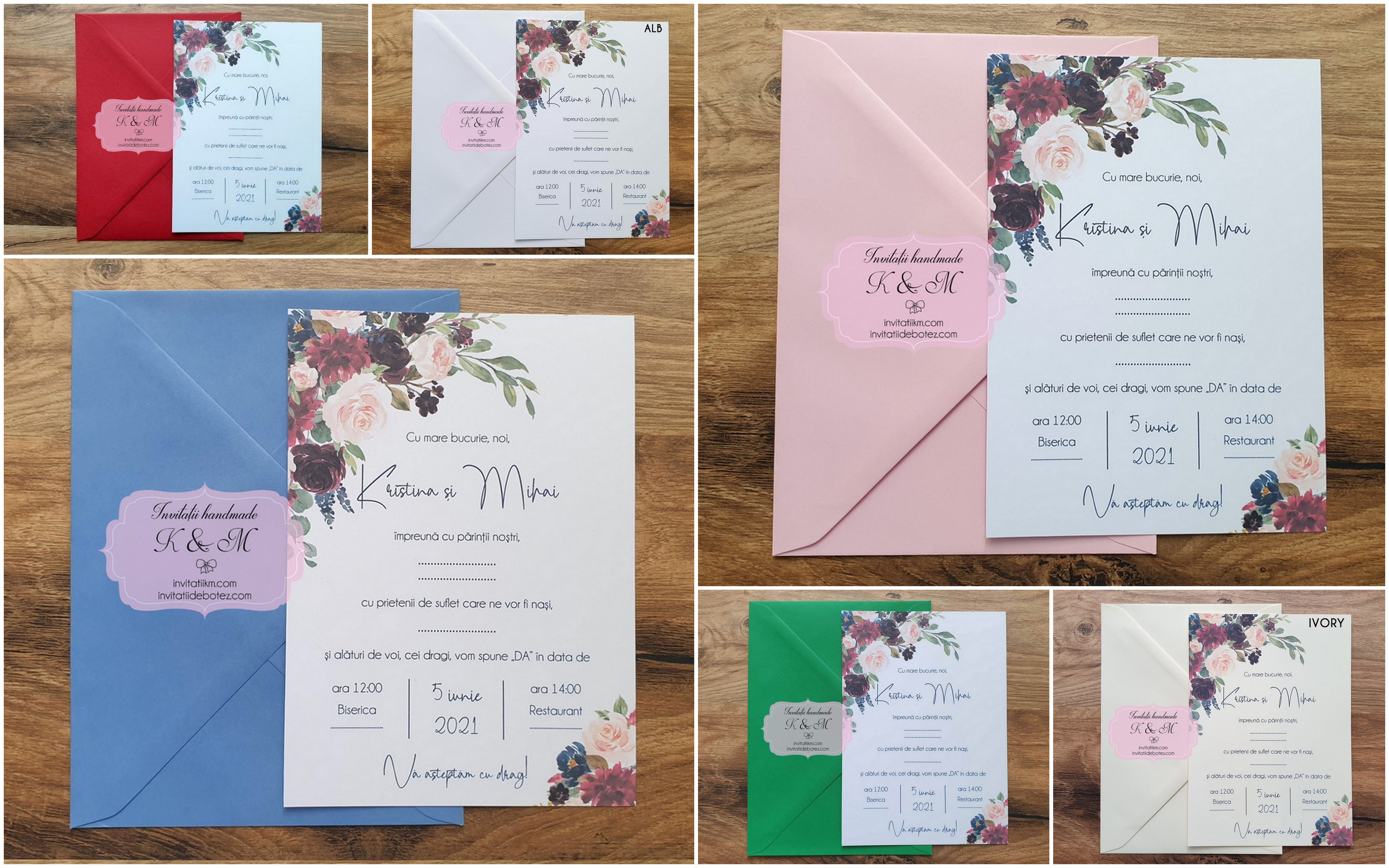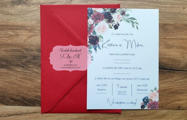Invitatii de nunta cu flori bleumarin si burgundy si plicuri asortate