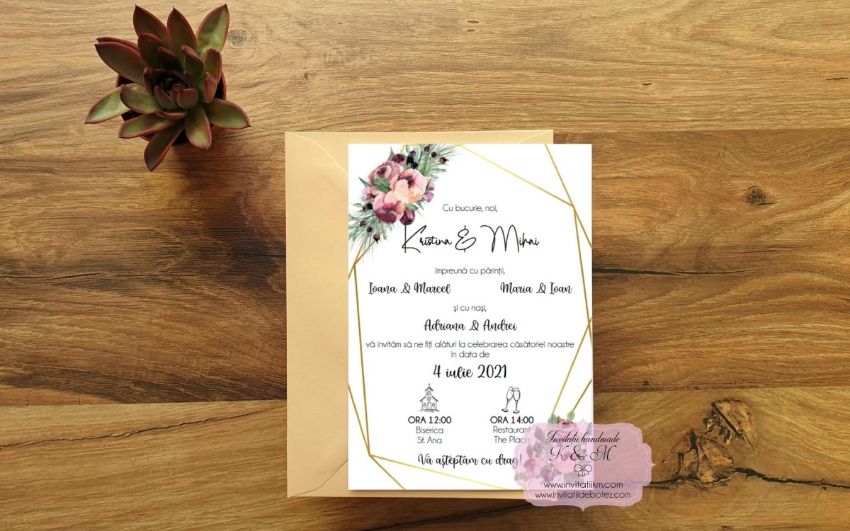 Invitatii de nunta cu flori piersica si mov pruna, chenar geometric si plicuri asortate