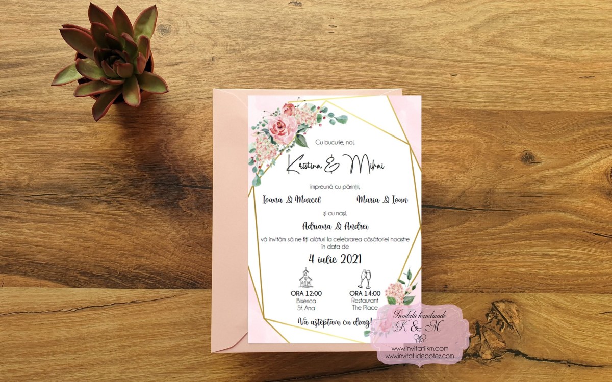 Invitatii de nunta cu flori roze, roz pal, chenar geometric si plicuri asortate