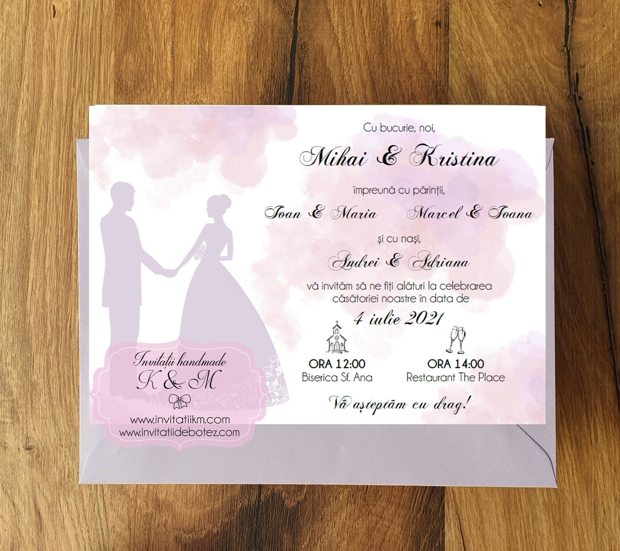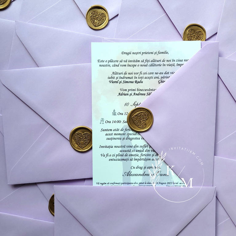 Invitatii de nunta cu mire si mireasa si plicuri asortate