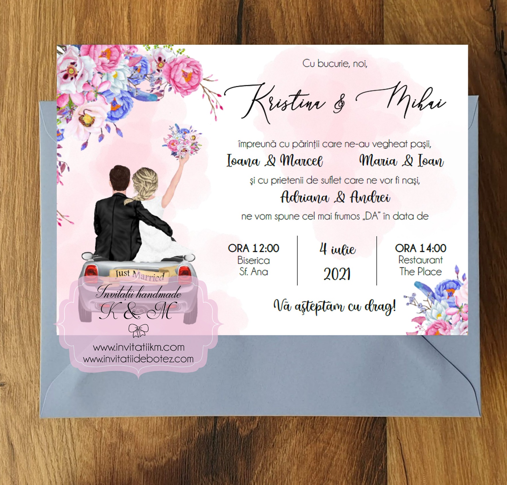Invitatii de nunta cu mire si mireasa in masina (spre luna de miere :D) si plicuri asortate